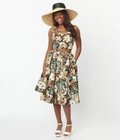 This adorable 1950’s style midi swing skirt from Hell Bunny is crafted in a lightweight black woven fabric and features tan, white and green tropical print throughout. Complete with a button up front and side pockets.