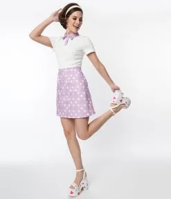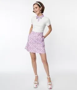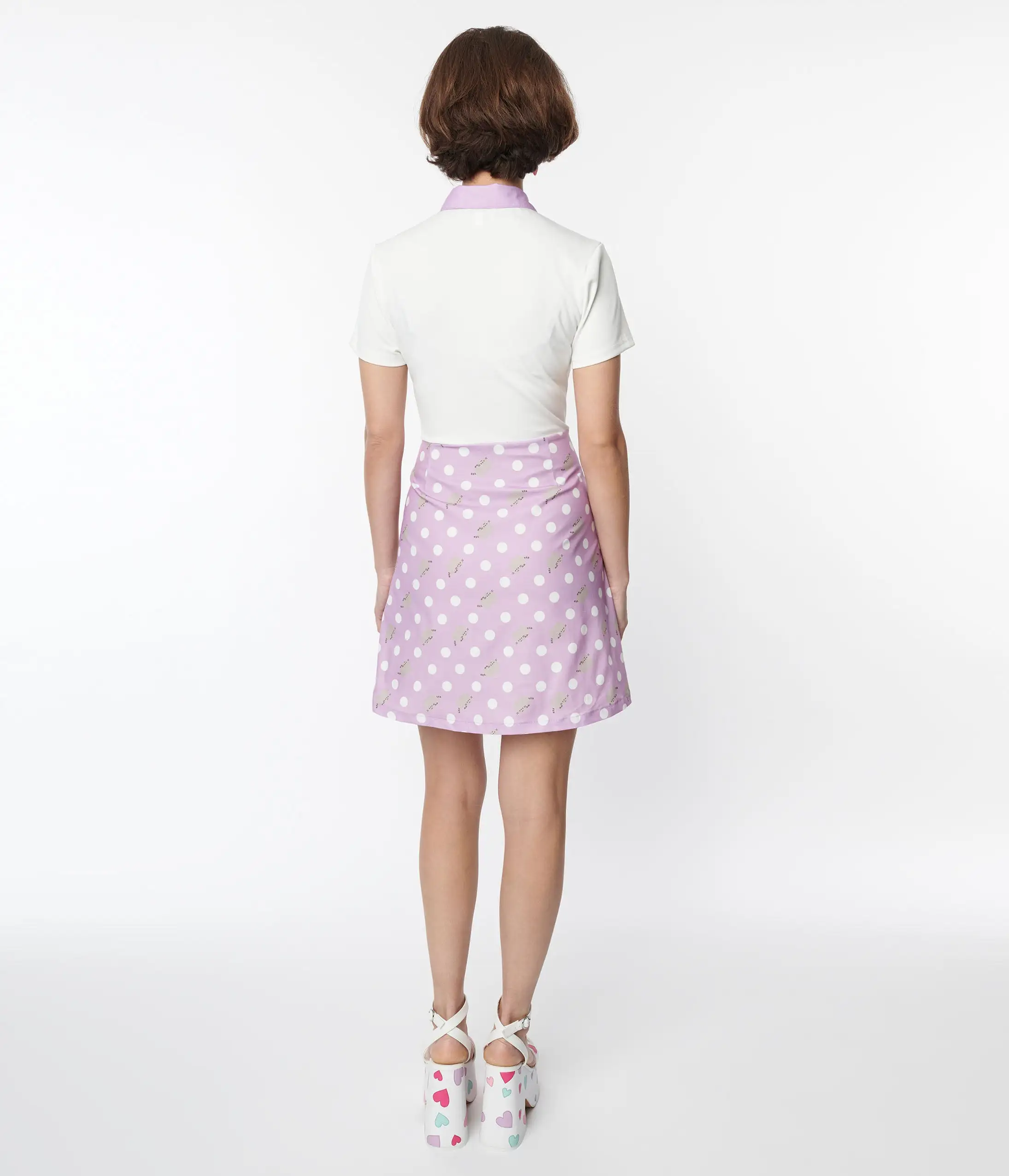 This sweet 1960’s style shift dress, in collaboration with Pusheen, is crafted in a white and lavender woven fabric and features white polka dots and Pusheen throughout. Featuring a partial button up front leading to a collared neckline and anchored by short sleeves. Complete with a side zipper and side pockets.