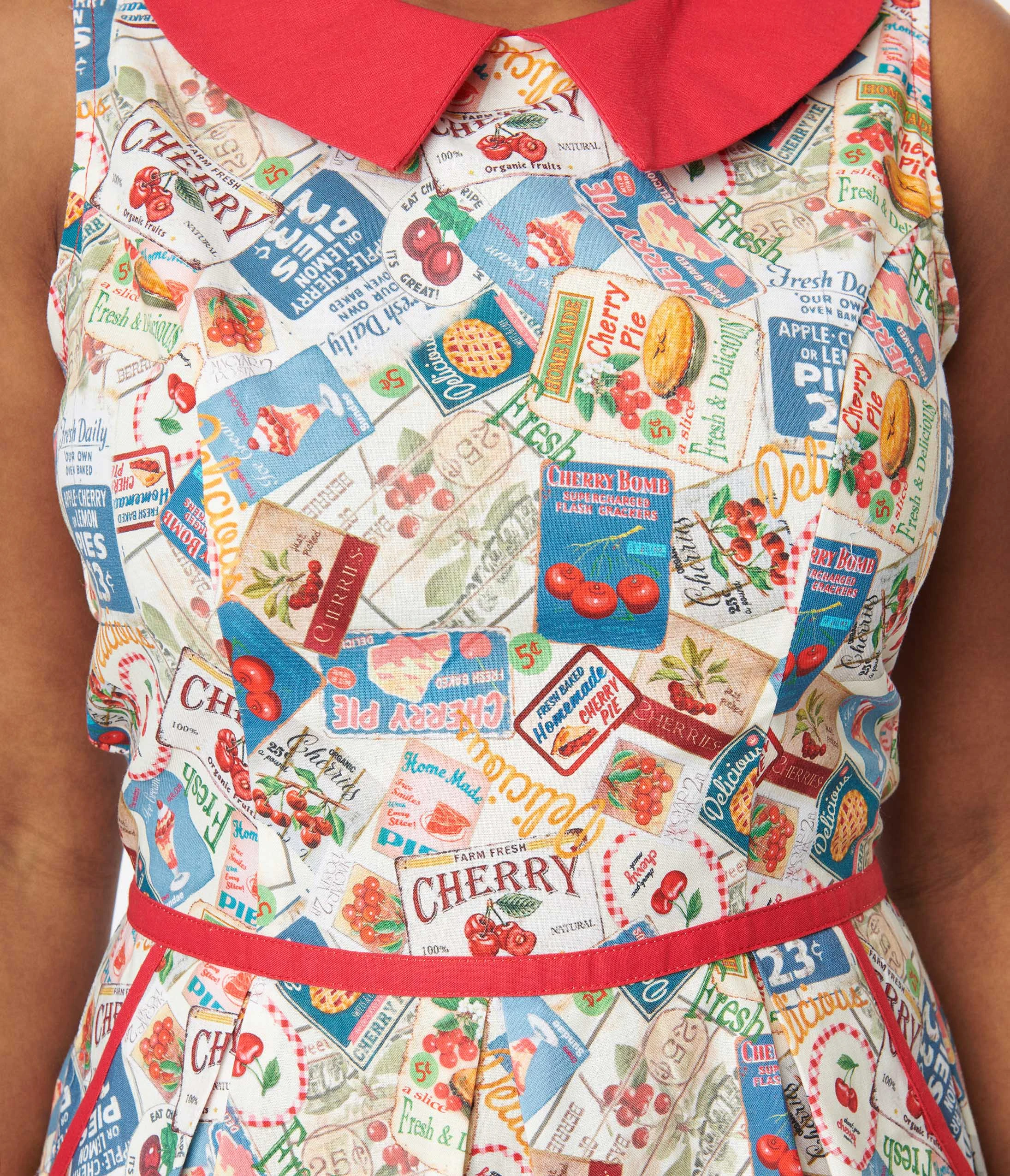 This retro inspired swing dress is an absolute showstopper. The pointed peter pan collar, along with the bold red piping, gives the dress a charming vintage vibe, while the playful cherry pie advertisement design adds a pop of color and fun. The back zipper ensures a comfortable and secure fit, and front pockets add a touch of practicality to this playful dress.
