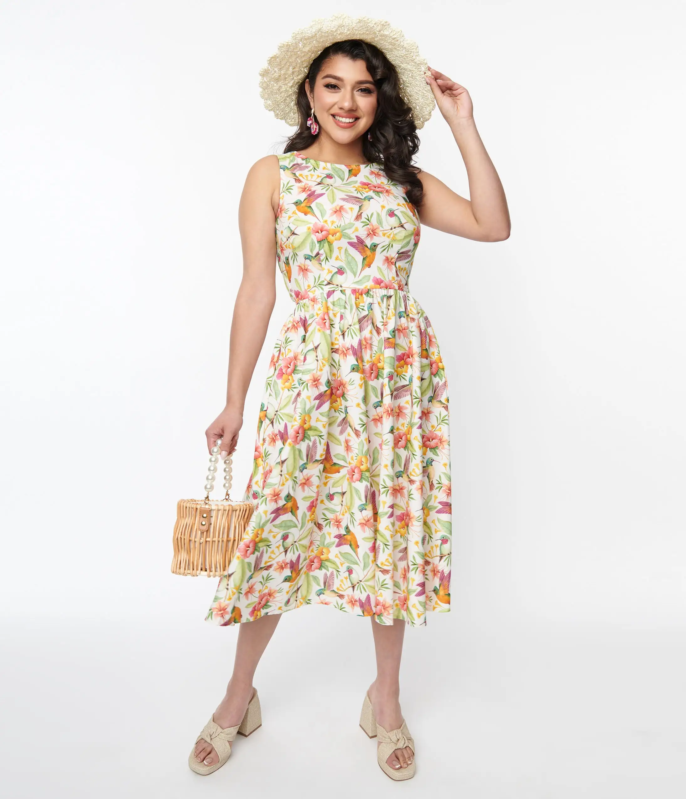 This charming 1950s style midi dress is set in a white woven dancing with precious hibiscus flowers and hummingbirds throughout. Outfitted with a high scoop neckline and elastic waist. Complete with a back zipper and side pockets!