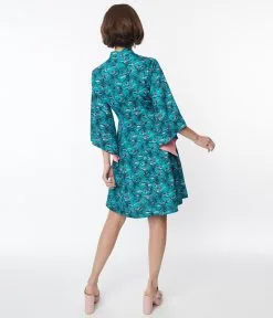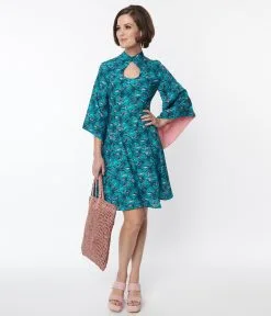 This groovy 1960s style fit and flare dress is crafted with a teal woven and boasts relaxing palm trees throughout. Outfitted with a standing collar keyhole and framed with pink interior flounce sleeves. Complete with a back zipper and collar button.