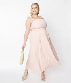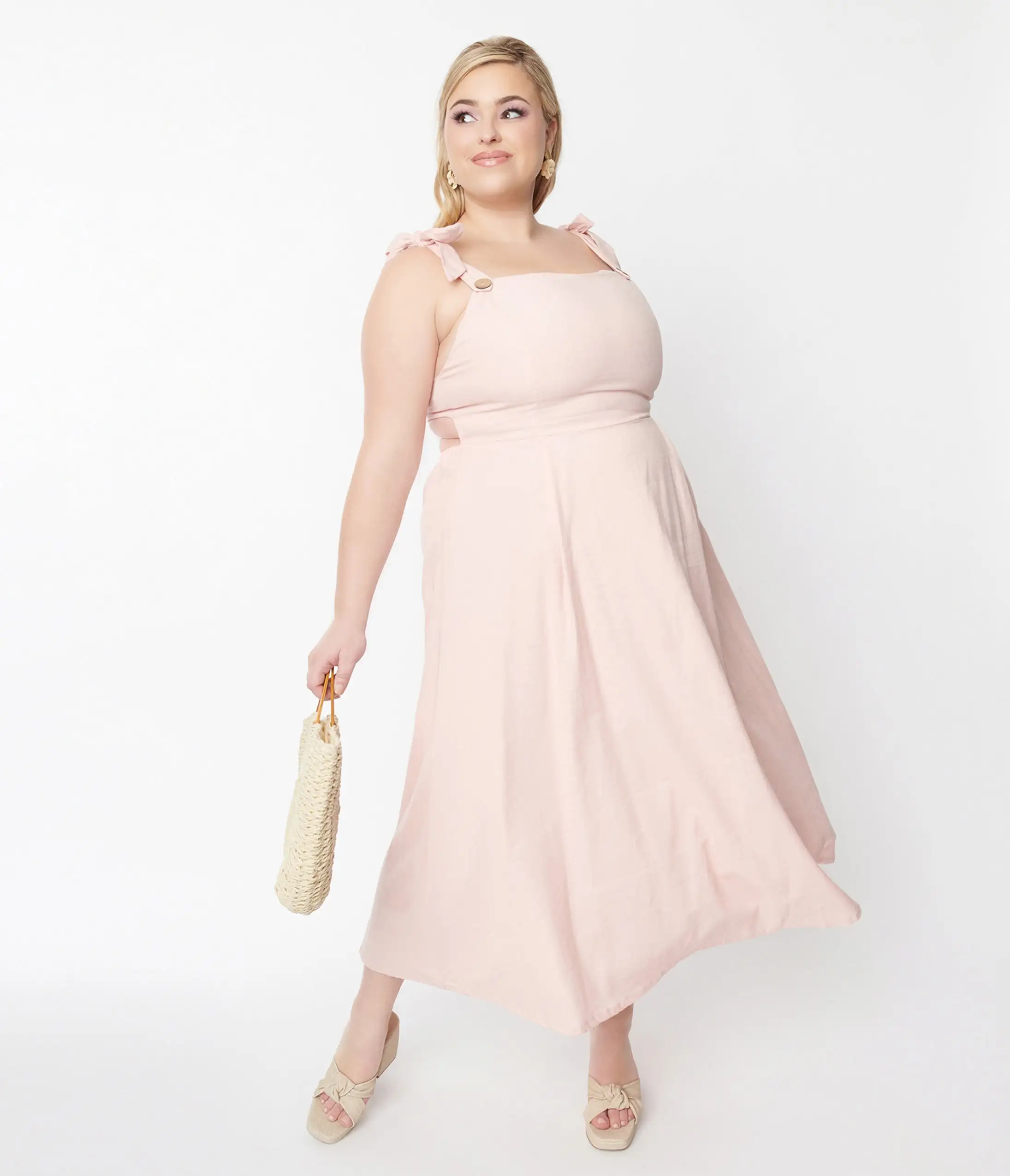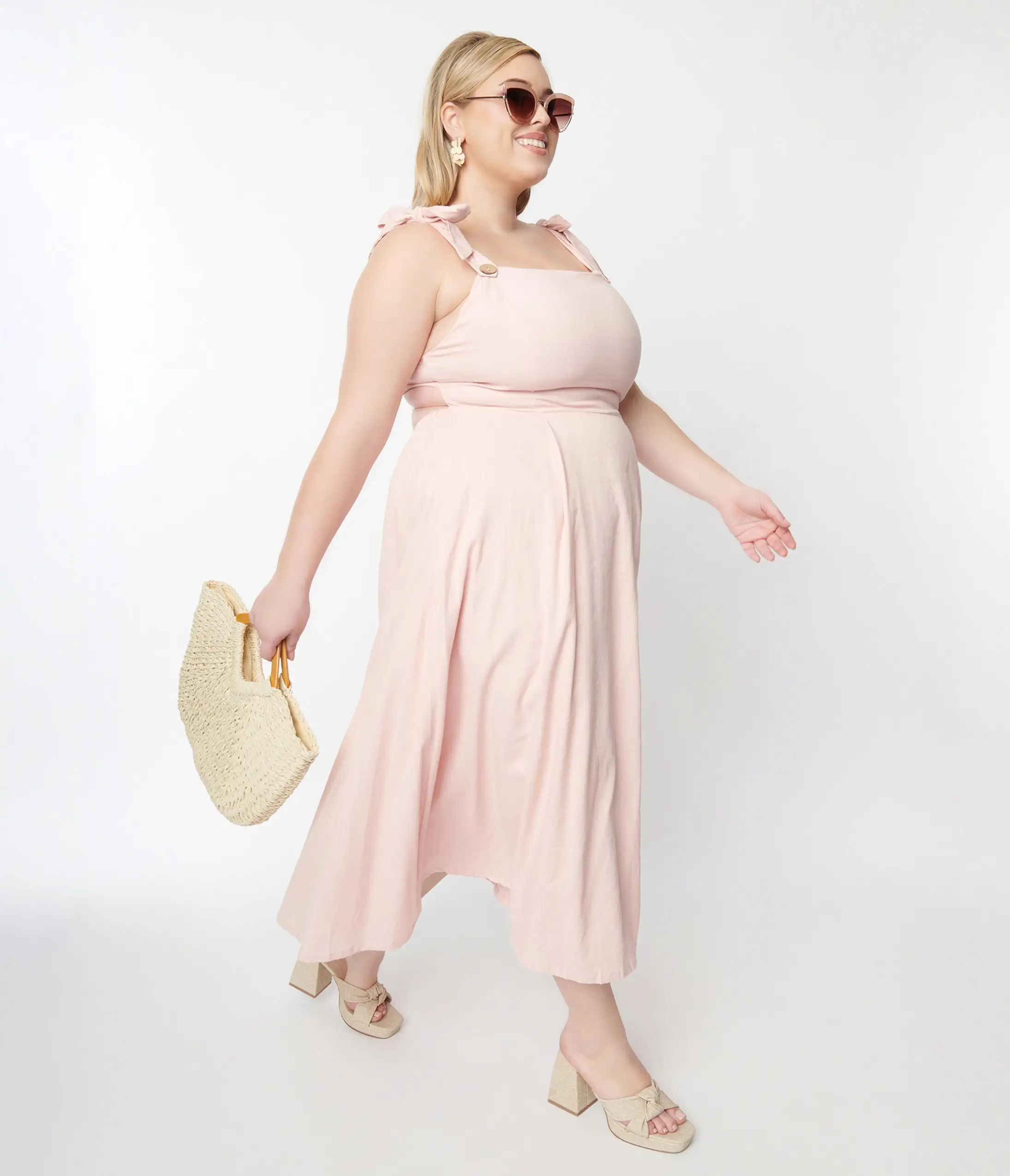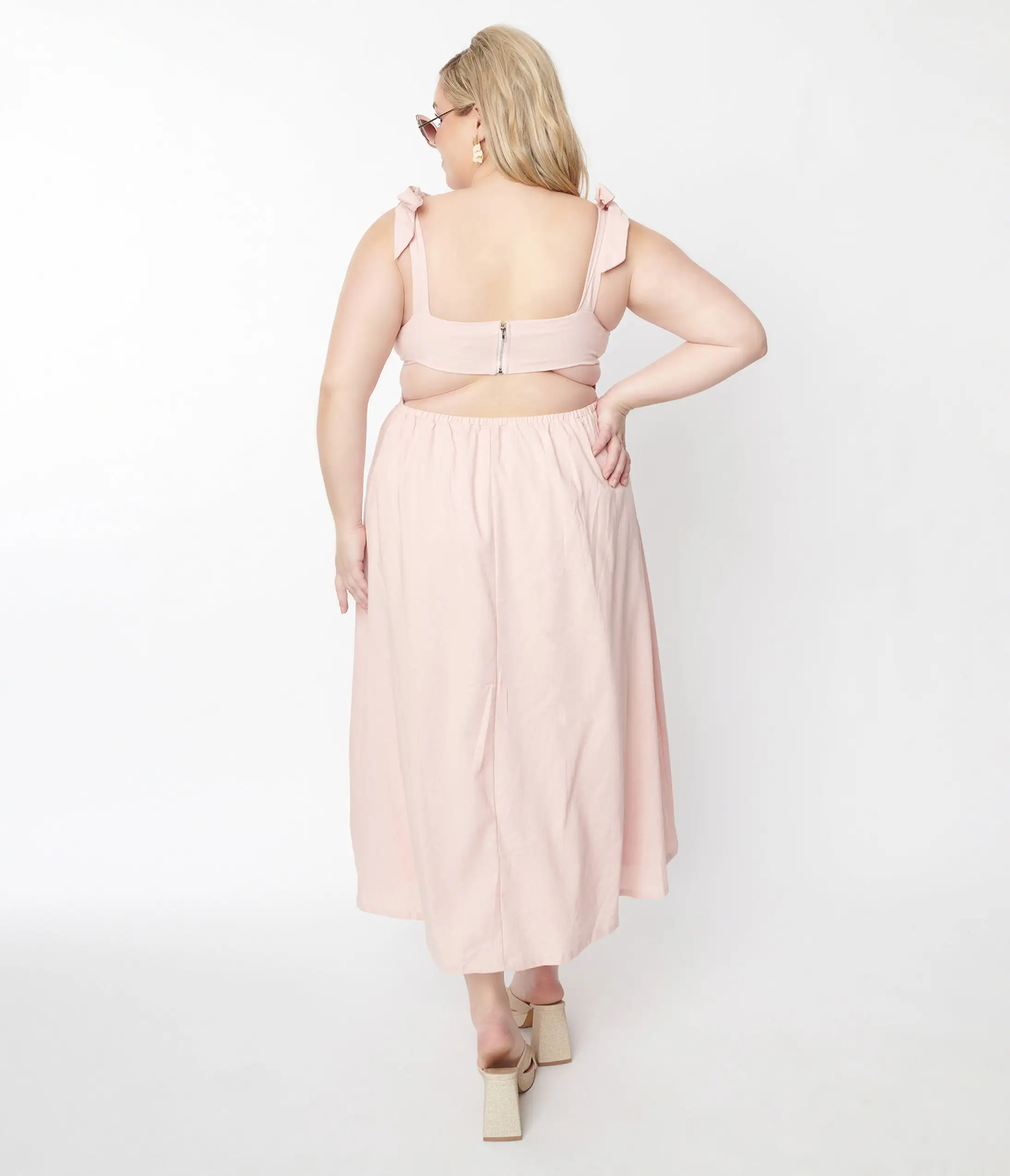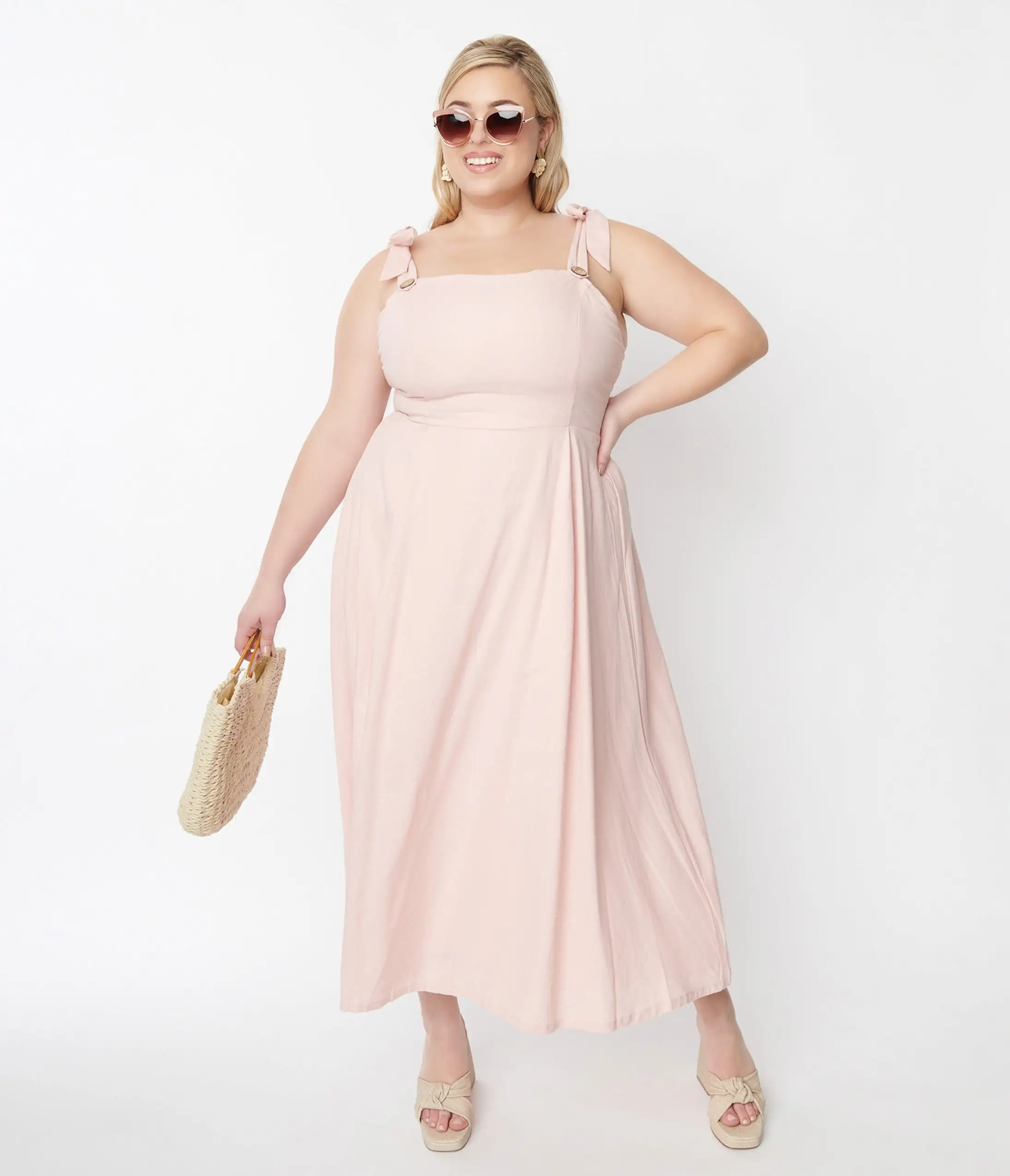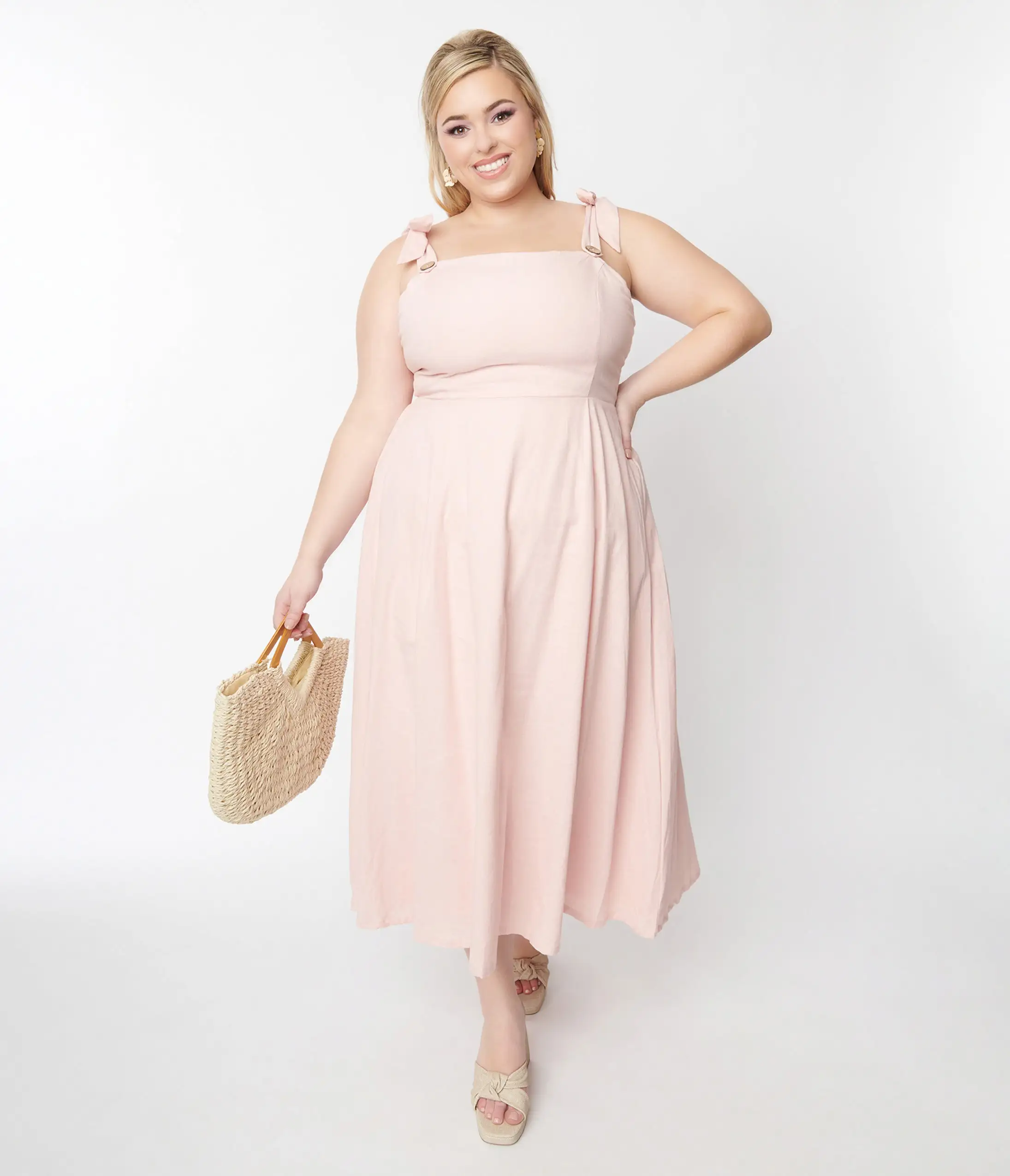 This chic plus size midi dress is crafted in light pink woven fabric and features self-tie shoulder straps. Featuring a flattering fitted bodice that cinches in the back with a zipper and a lovely cutout back. The midi length hemline adds a touch of elegance, making it an ideal choice for a summer wedding or garden party. The adjustable & removable shoulder straps ensure a perfect fit, making this dress both comfortable and stylish.