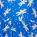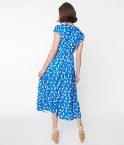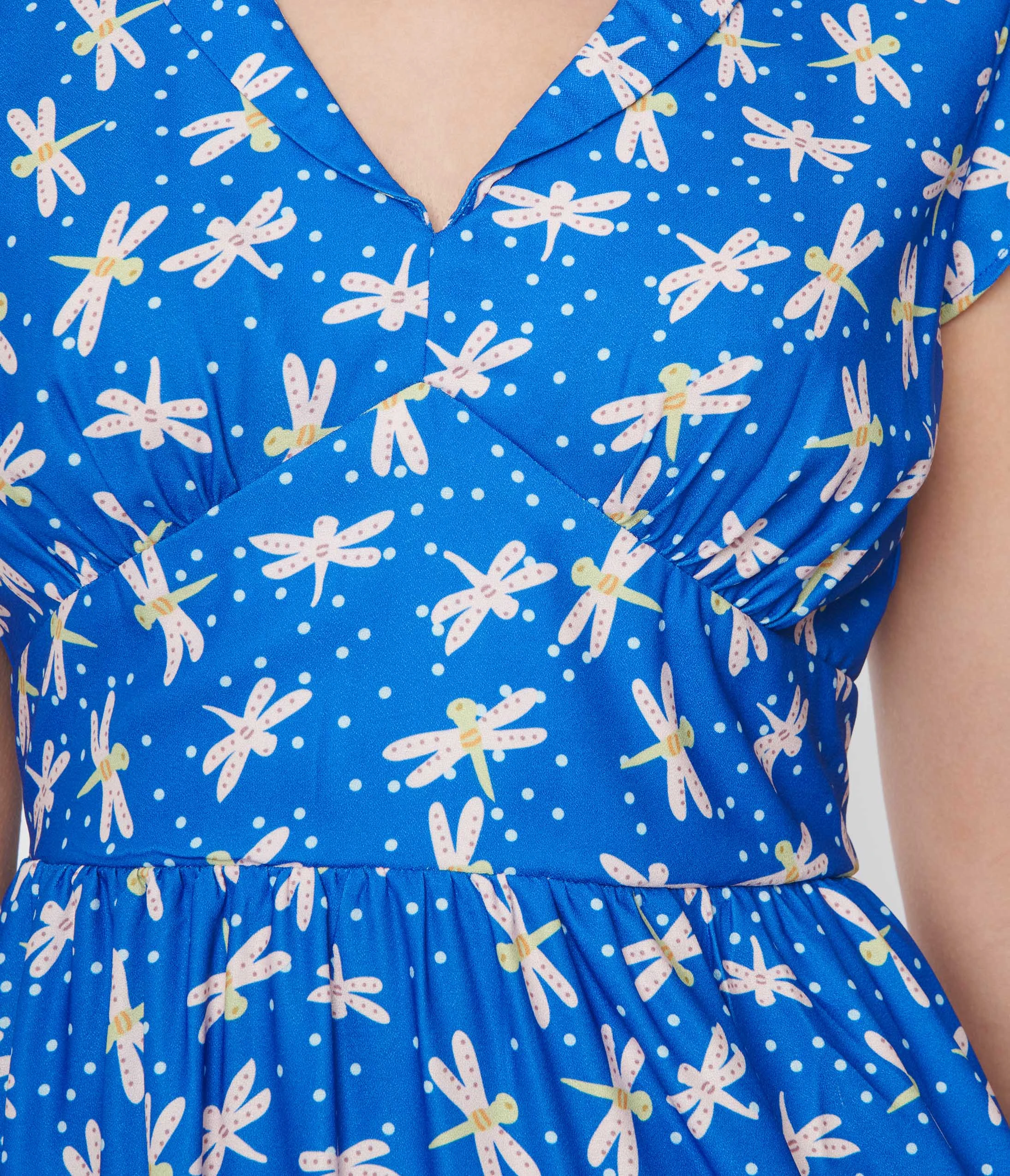This charming 1950s style midi dress is crafted with a blue woven dancing with dragonflies and white pin dots throughout. Outfitted with short sleeves and a collared V neckline. Complete with a back zipper.