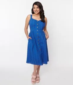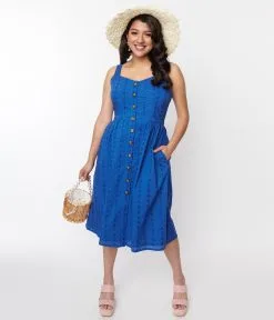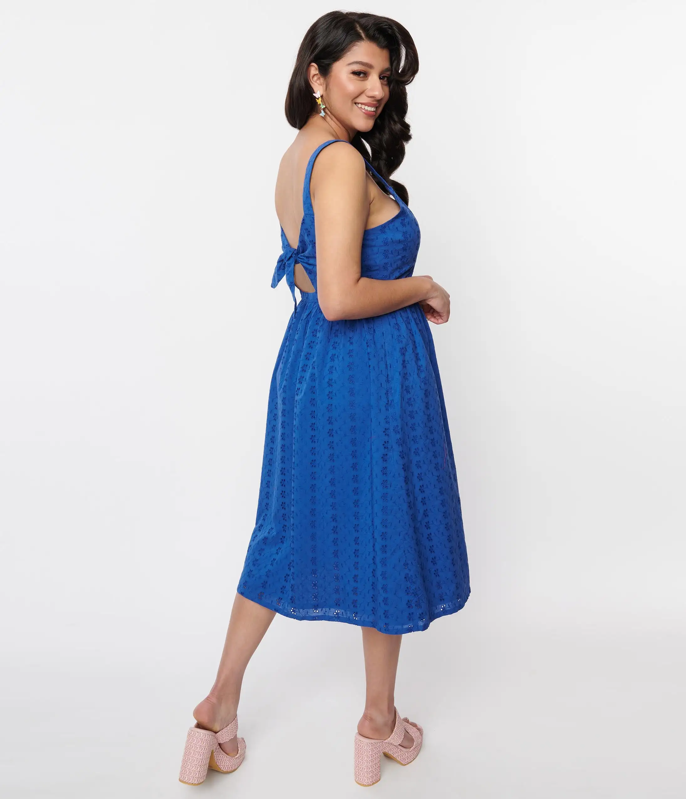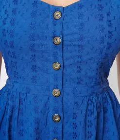 A sweetheart silhouette full of mid-century fabulousness, this brilliant sundress is crafted in a marvelous royal blue floral eyelet cascading throughout. The sweetheart neckline and sleeveless design is cinched with a self tie back bow while the banded waist is cinched with a button up front. The sweet A-line skirt is outfitted with side pockets for modern function!