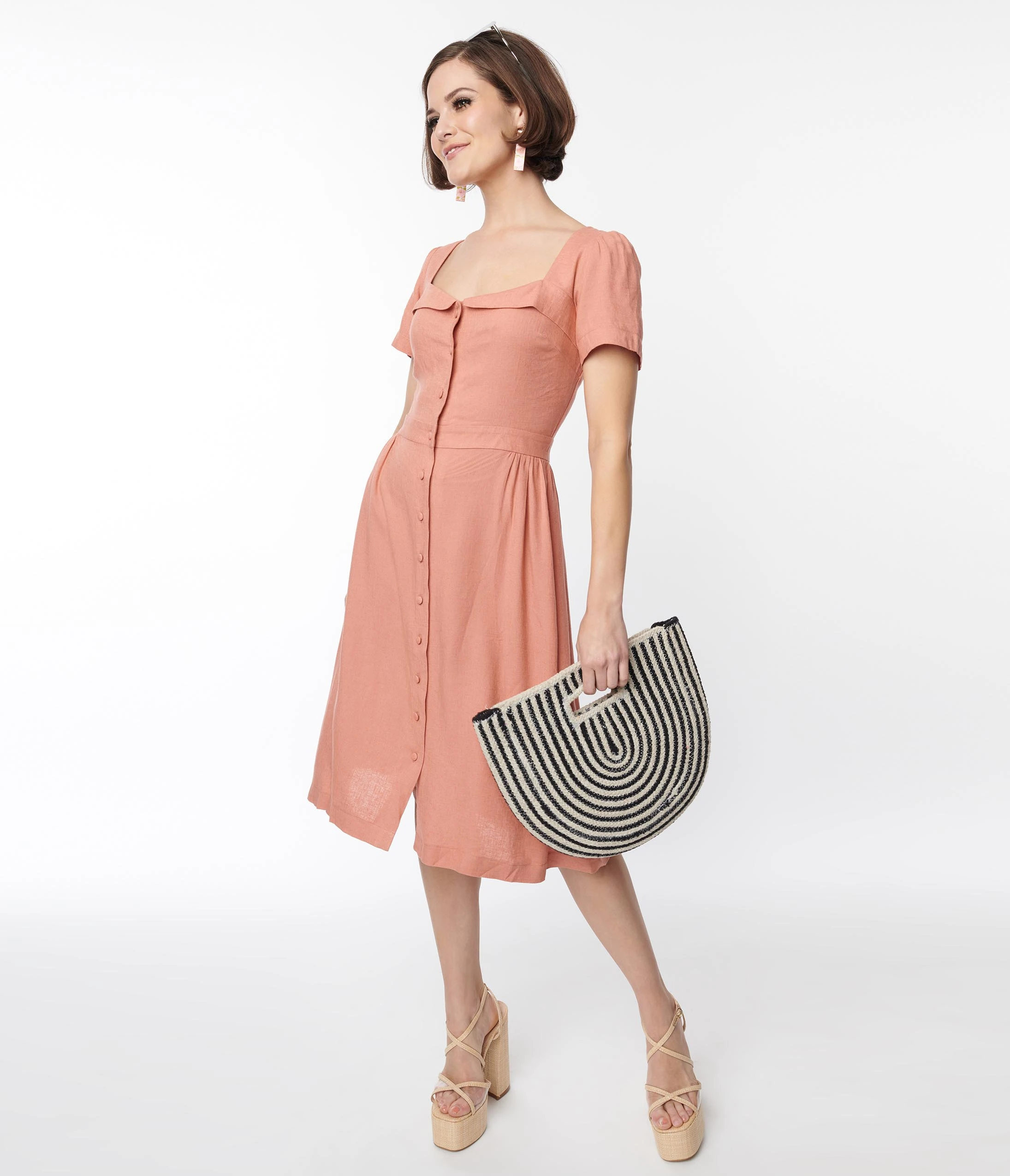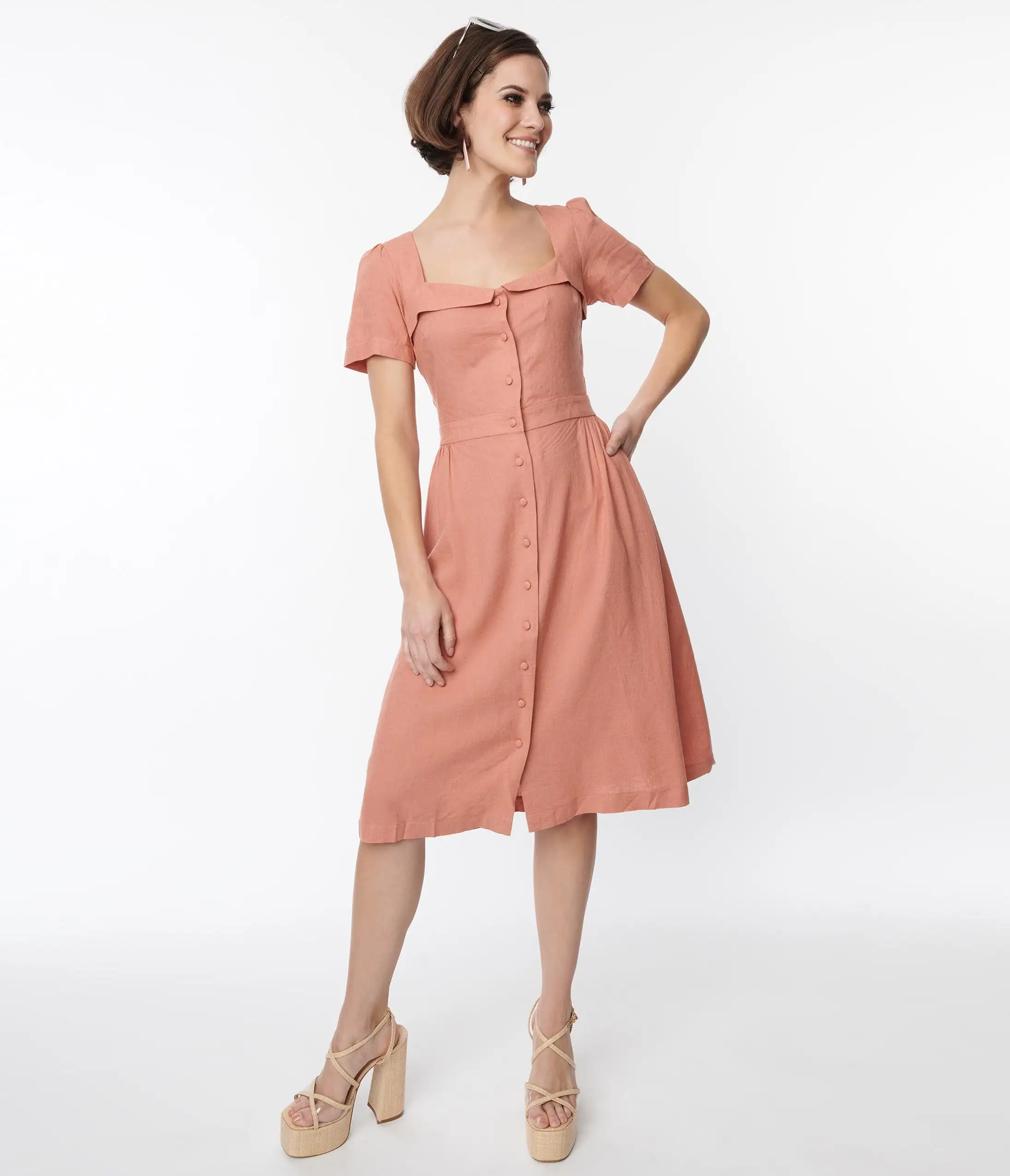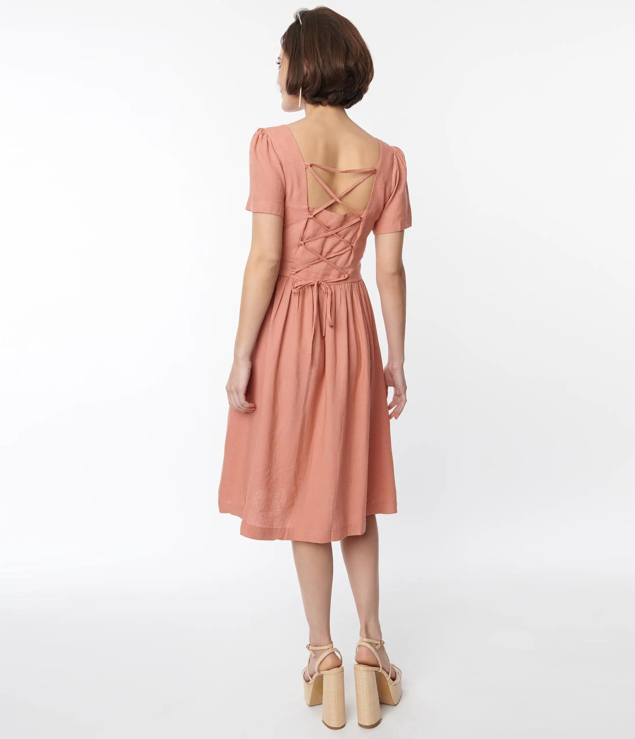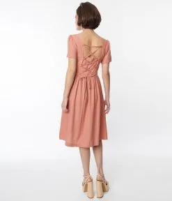 This stunning 1950s style fit and flare dress is set in a beautiful light coral woven. Outfitted with a button down front and self-tie criss cross back.