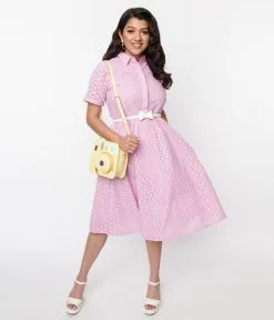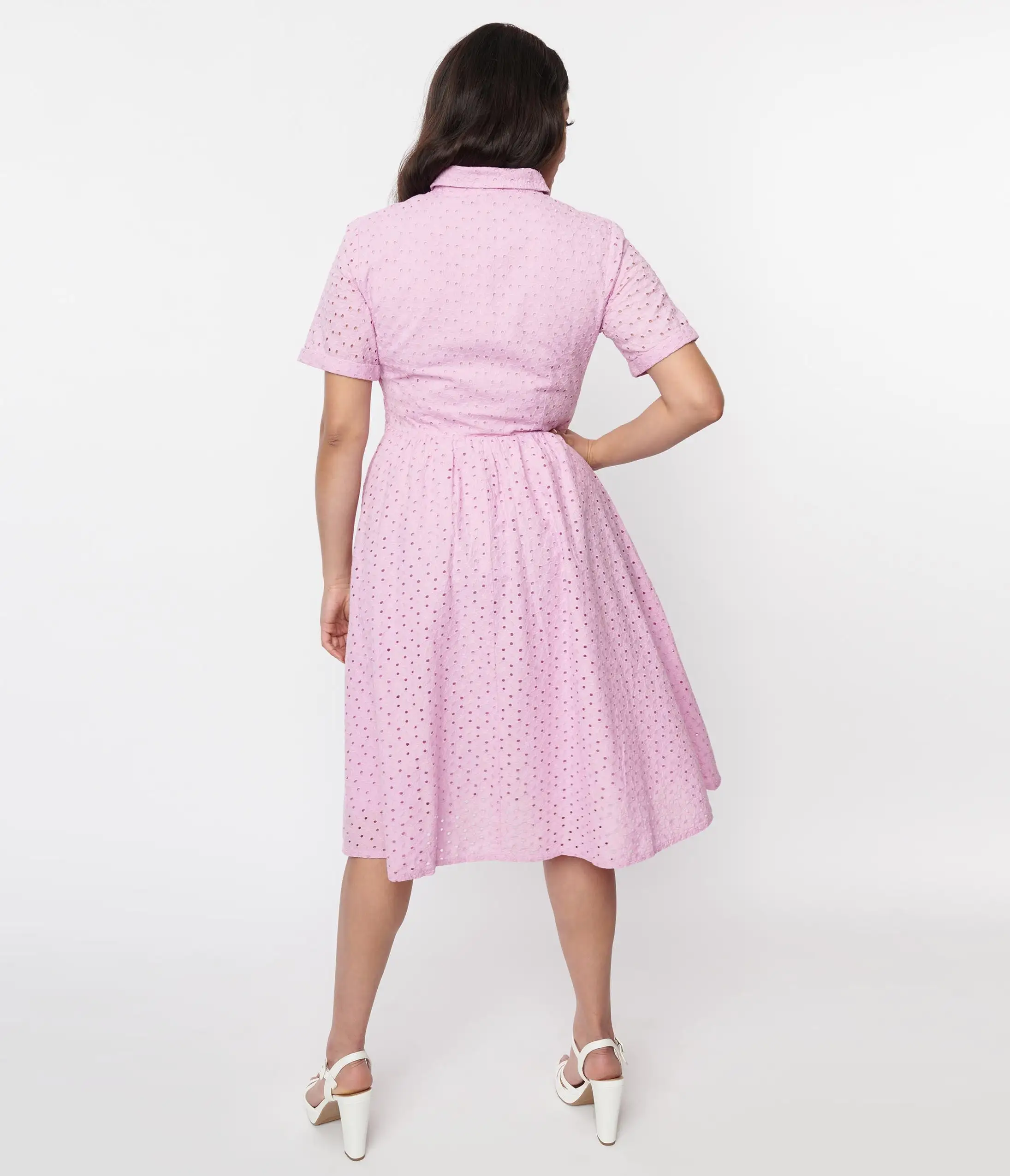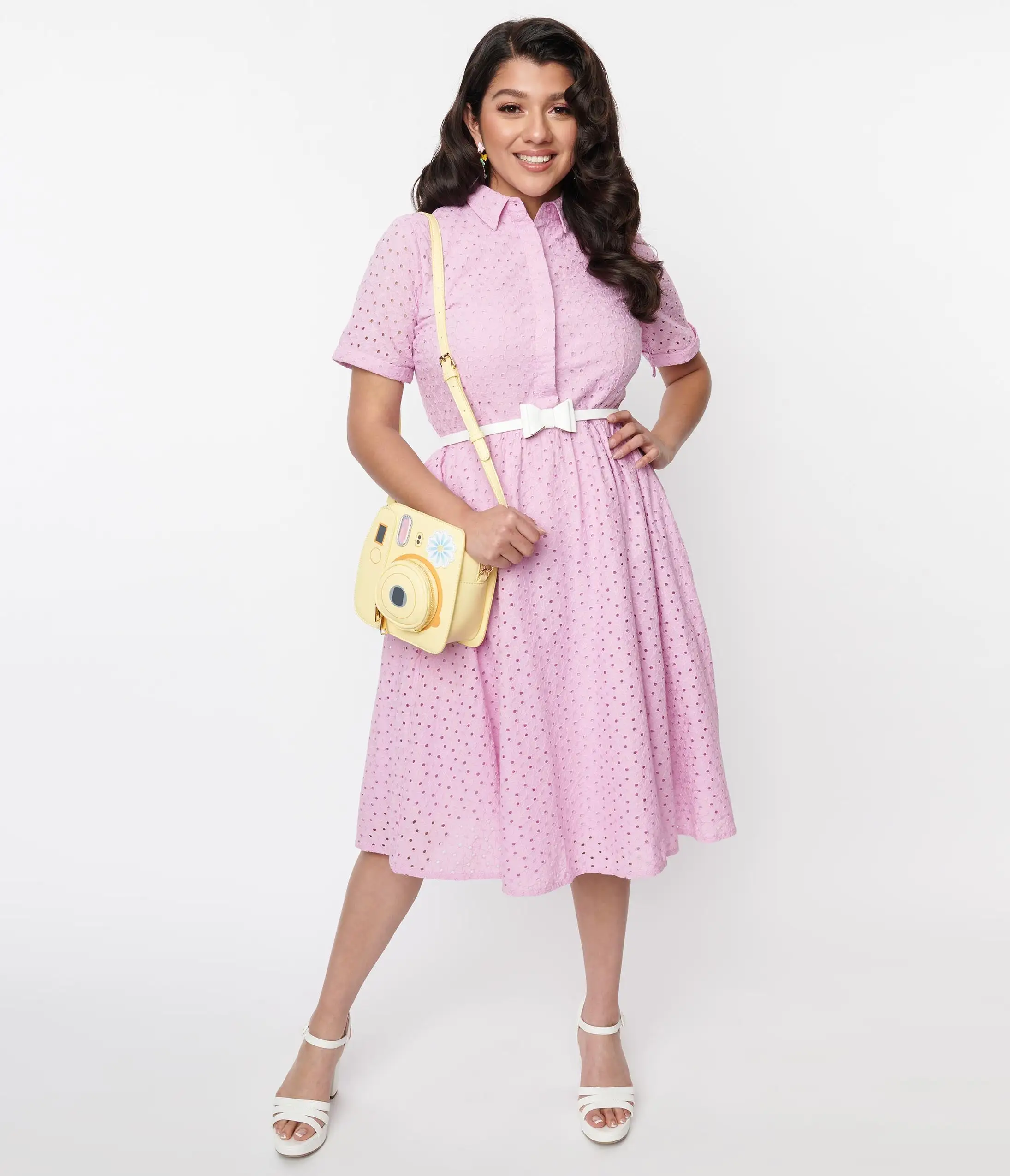 Crafted in lilac cotton eyelet, with a button up bodice leads to a classic collar, framed by short sleeves while the seamed waist is cinched with a side zipper. The swing skirt drops to your knees, complete with side pockets.