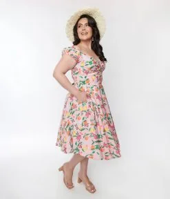 Bloom this season, darling! This lovely 1950s style swing dress is set in a pink woven dancing with sweet lemons and oranges throughout. The ruched sweetheart neckline is framed with short elastic cuff sleeves and outfitted with a smocked back. Complete with a back zipper and side pockets!