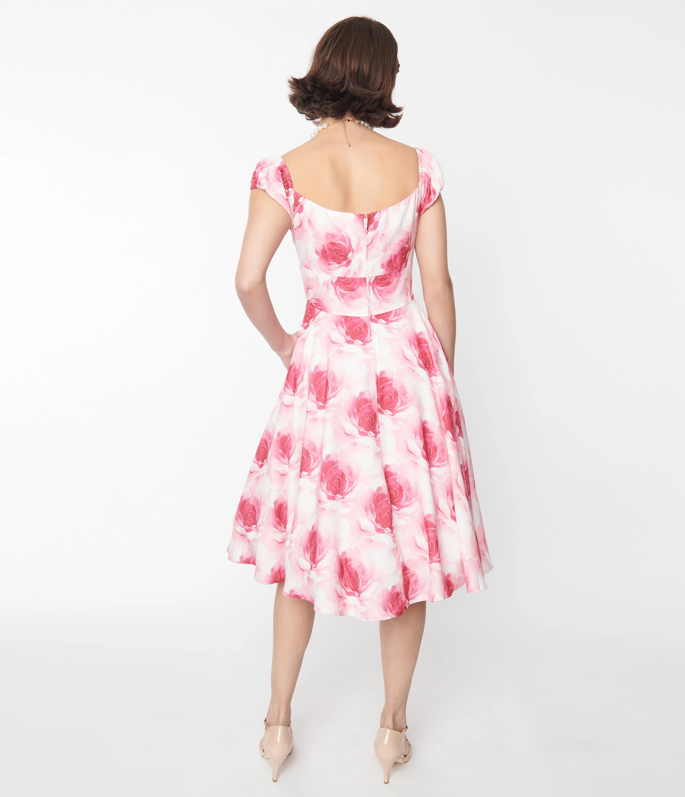 This darling 1950s style swing dress is crafted in a white woven dancing with pink roses throughout. Outfitted with a ruched self-tie sweetheart neckline and short elastic cuff sleeves. Complete with a back zipper and pockets.
