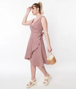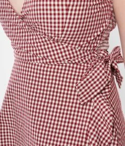 This lovely wrap dress is crafted in a red and white gingham woven fabric and features a sleeveless silhouette with a v-neckline. Complete with a self-tie back sash, back zipper and side pockets.