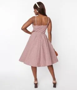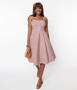 This beautiful gingham dress is a charming silhouette of cotton rust red gingham that’s meant for a frolic through downtown. The soft neckline features a gathered bust and is supported by adjustable straps while the wide banded waist elongates and slims your hourglass, complete with darling faux buttons for graceful vintage styling.