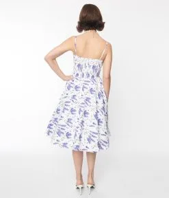 This charming 1950s swing dress is set in a white woven boasting lovely lavender florals throughout. Outfitted with a smocked back and adjustable spaghetti straps. Complete with a back zipper.
