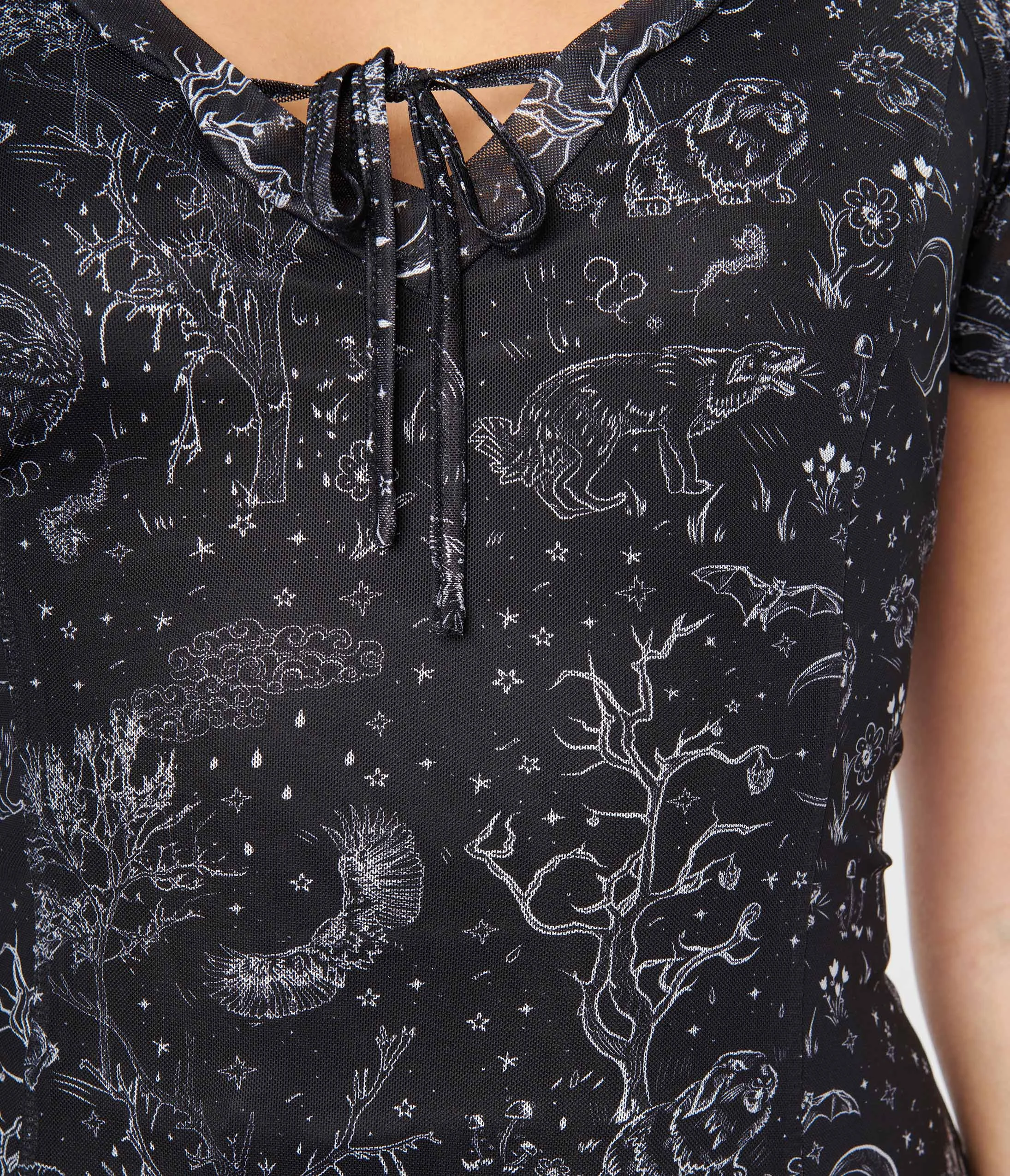 This spell-tacular shift dress is set in a black lightweight woven dancing with white mystical forest creatures throughout. Outfitted with a self-tie V neckline, elastic cuff short puff sleeves, and a ruffle hem.