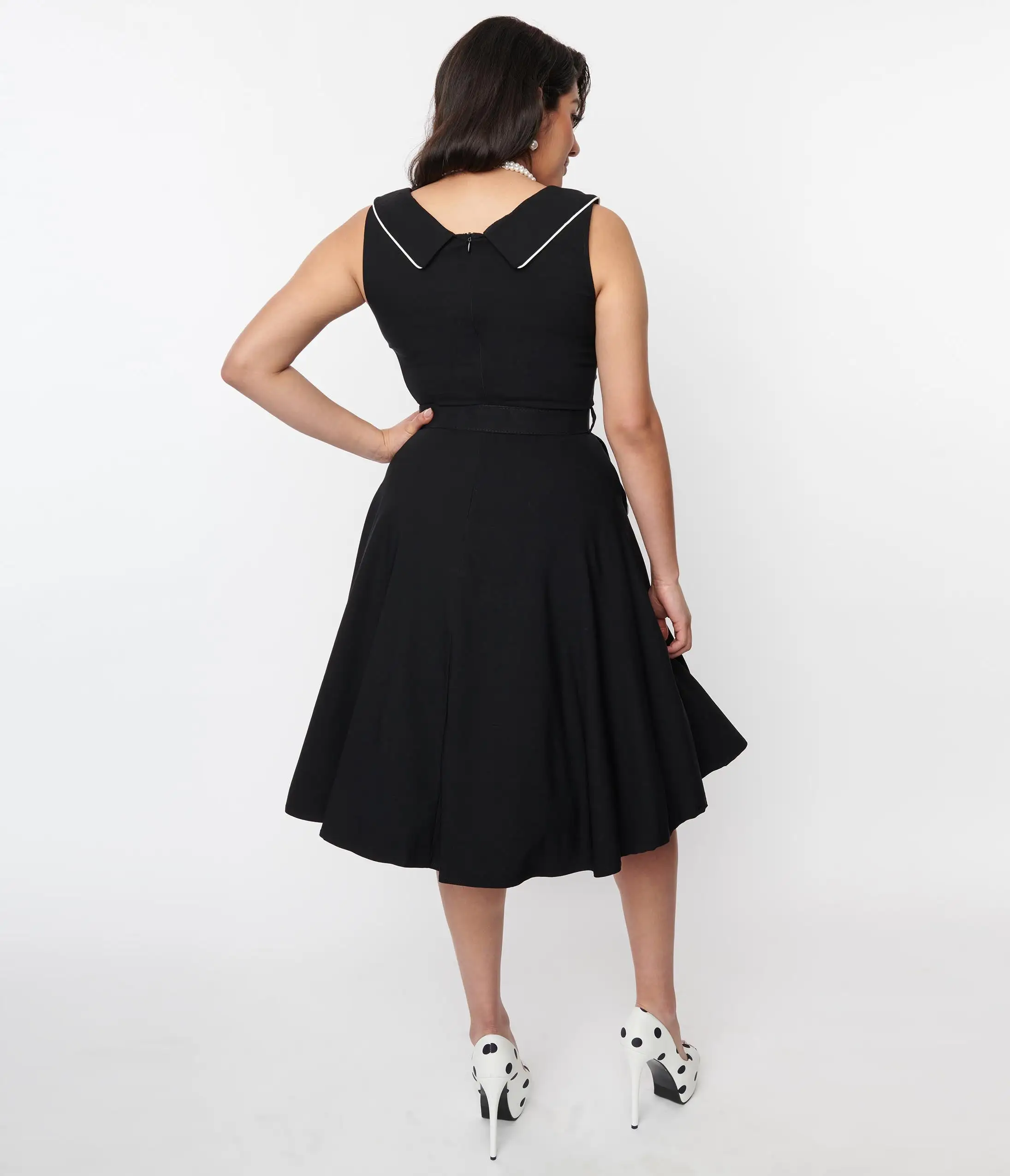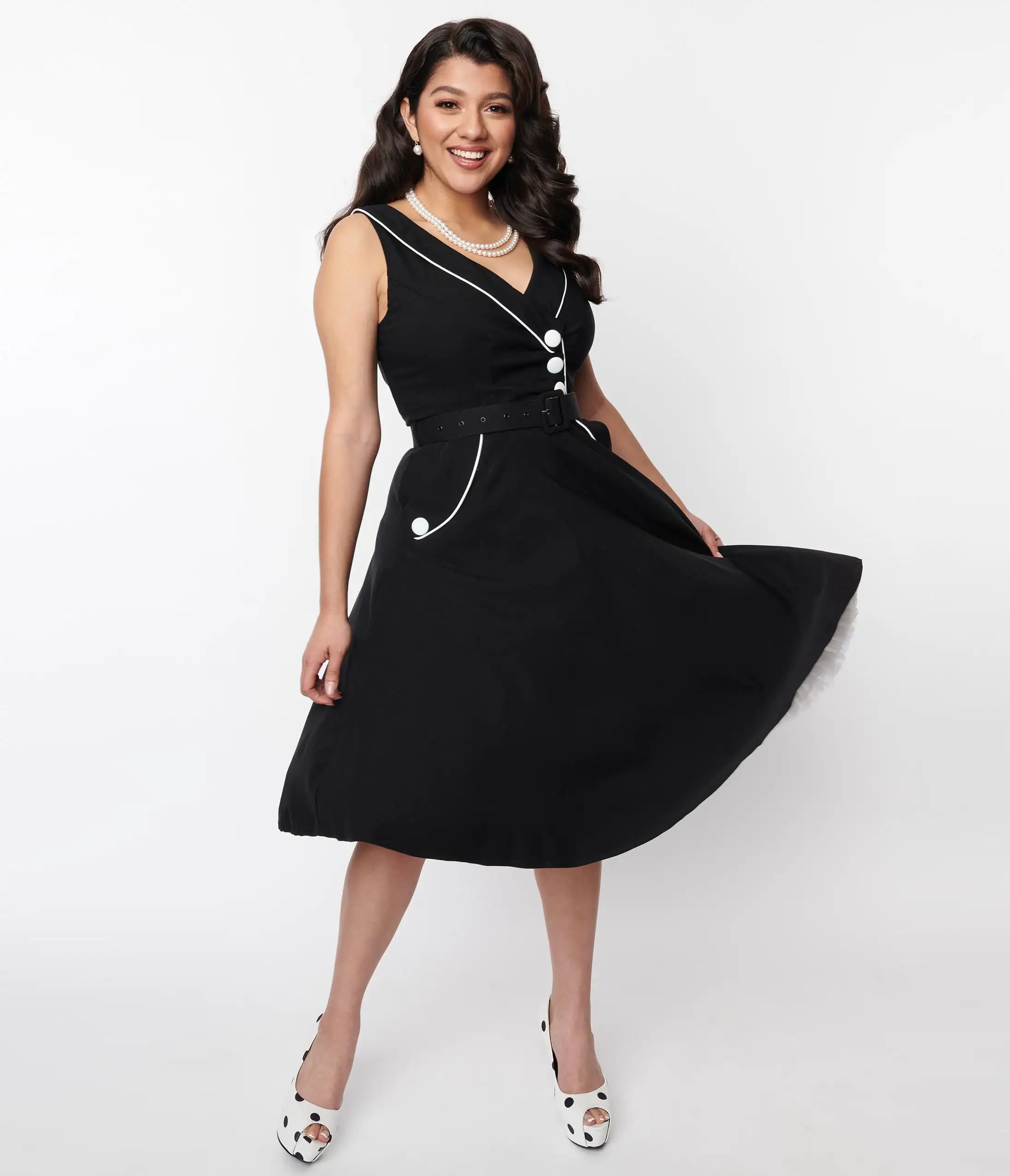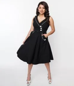 Take your style game to the next level with this 1950s style black swing dress from Voodoo Vixen featuring white piping and white buttons. The dress has an asymmetrical collared neckline and side pockets for convenient storage. The back zipper helps you slip in and out quickly, while the belt adds a chic touch to the dress.