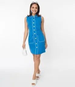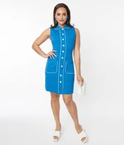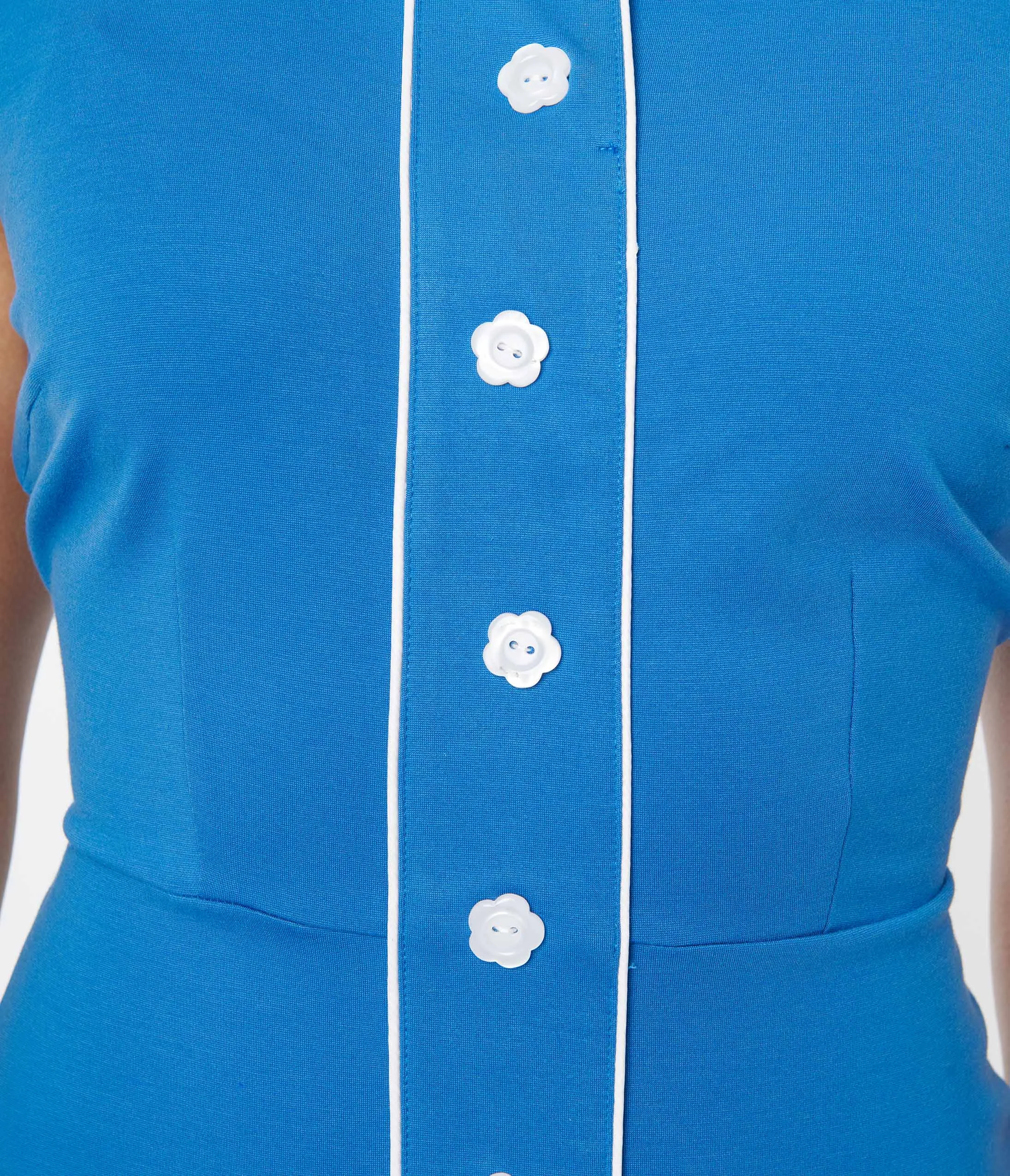 This gorgeous 1960s inspired bodycon dress is set in a blue stretch woven with white piping. Outfitted with a peter pan collar and adorable white floral faux buttons. Complete with front pockets.