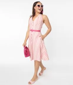 This lovely 1950s style swing dress from Voodoo Vixen is set in a woven boasting pink, white, and light green vertical stripes throughout. Outfitted with a halter neckline, smocked back, and button down front. Complete with side pockets and matching pink belt.