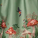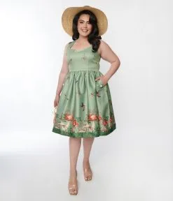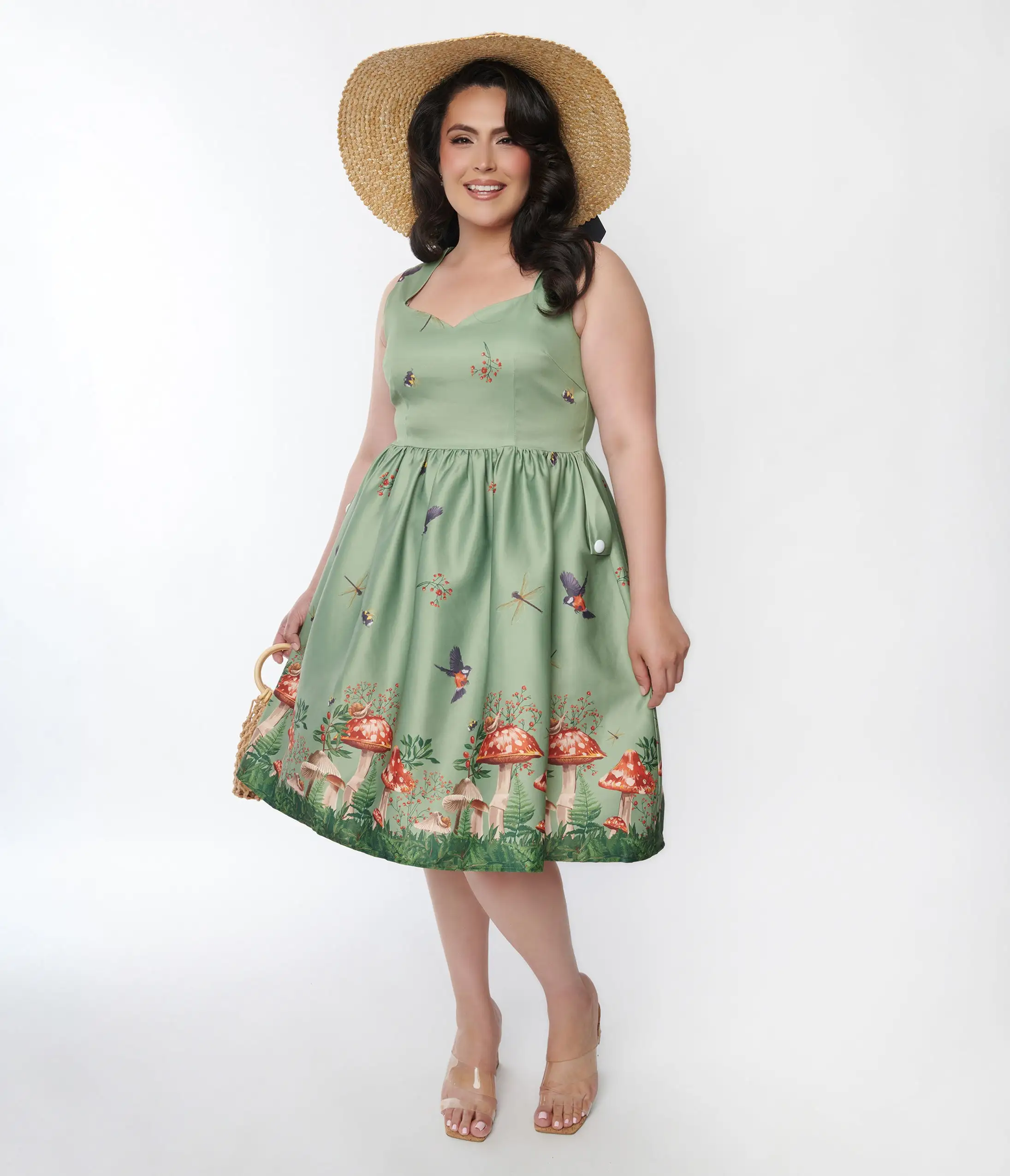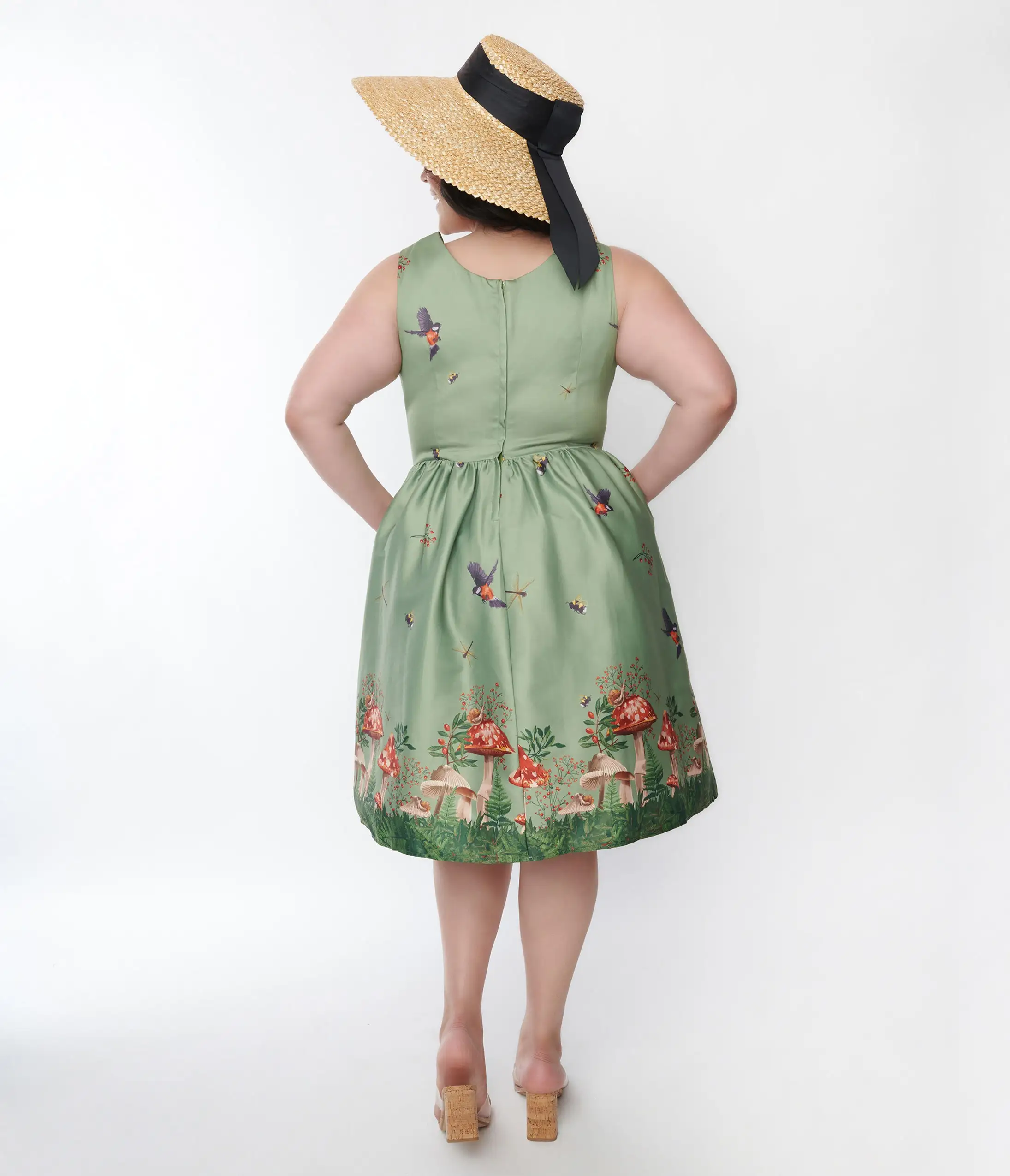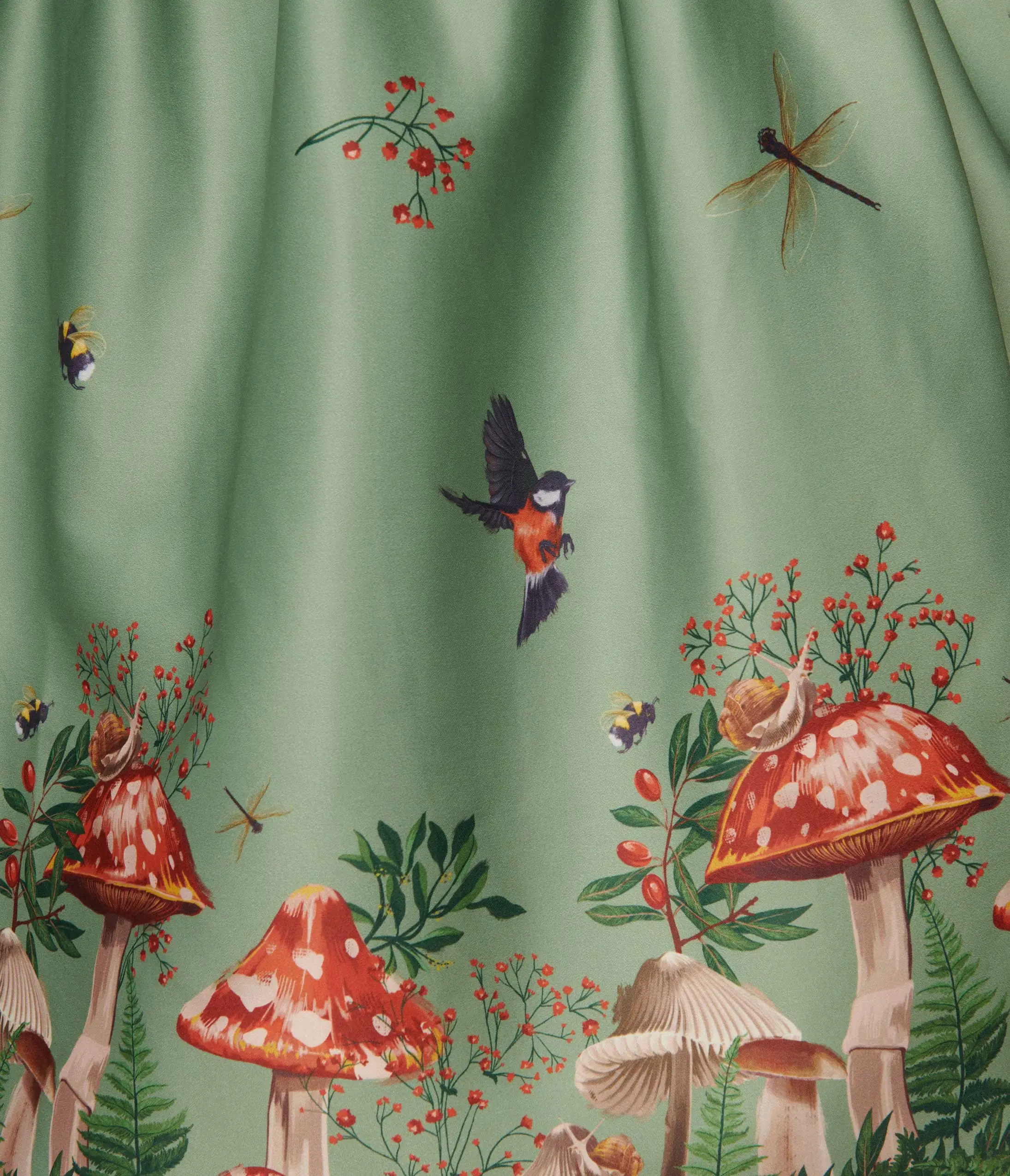 Get in touch with nature, dolls! This whimsical 1950s style swing dress is set in an olive green satin-like woven boasting a toadstool border and woodland life throughout. Complete with a back zipper and side pockets.