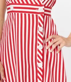 This charming 1940s style fit and flare dress from Voodoo Vixen is set in a woven boasting red and white vertical stripes throughout. Outfitted with a surplice V neckline, self-tie short sleeves, and button down front. Complete with side pockets.