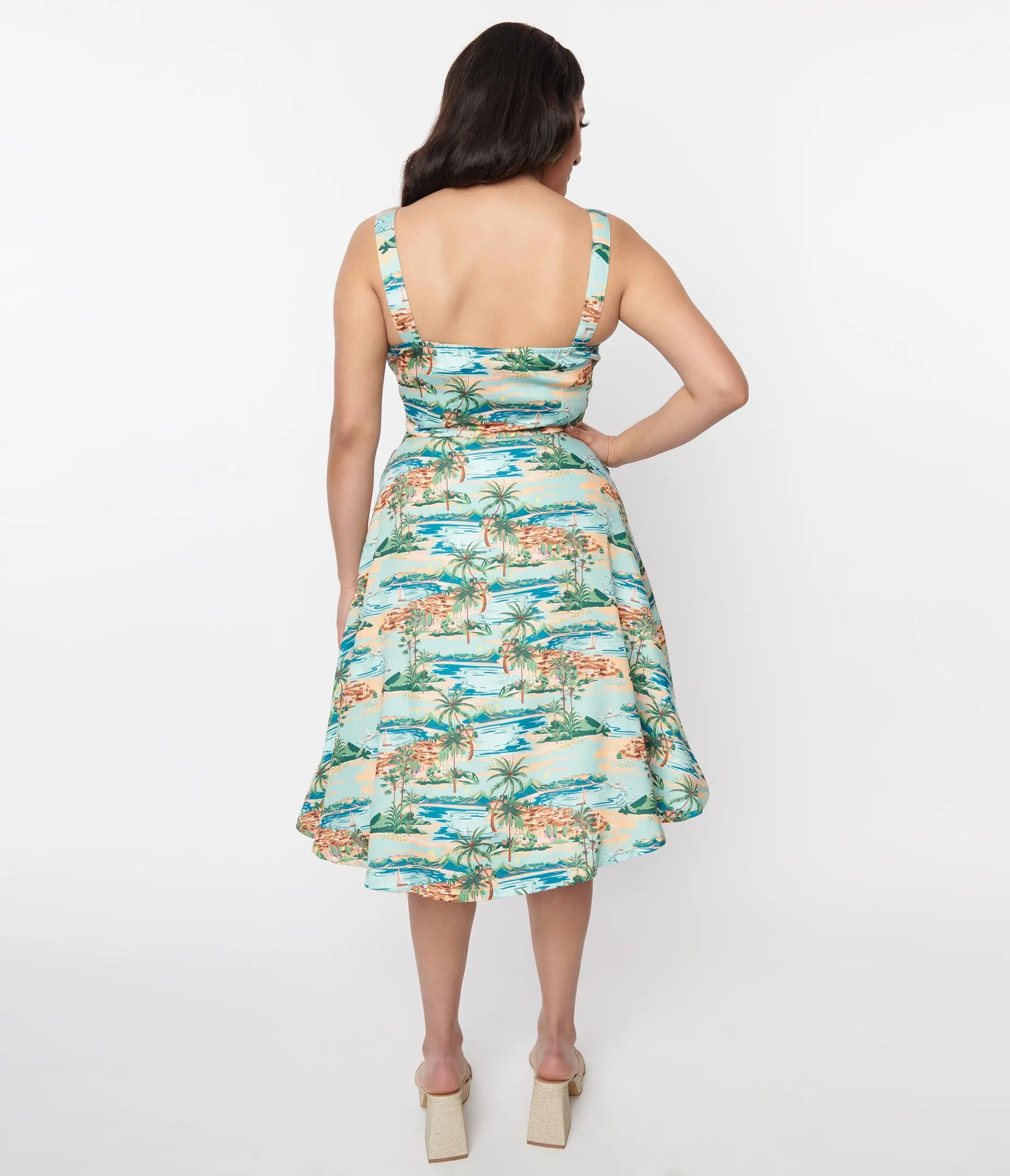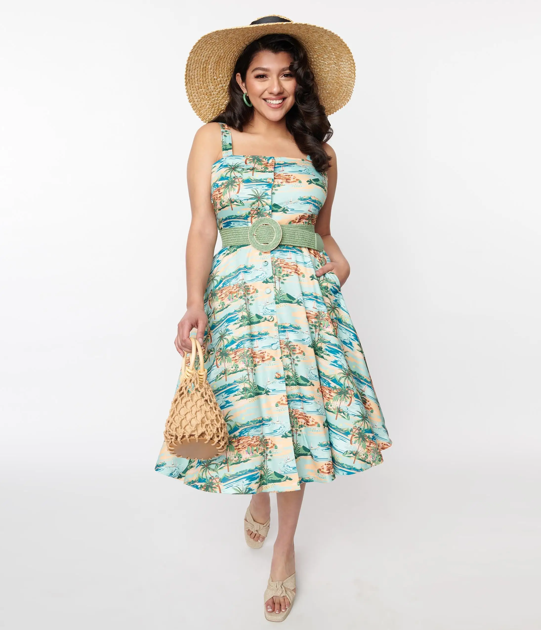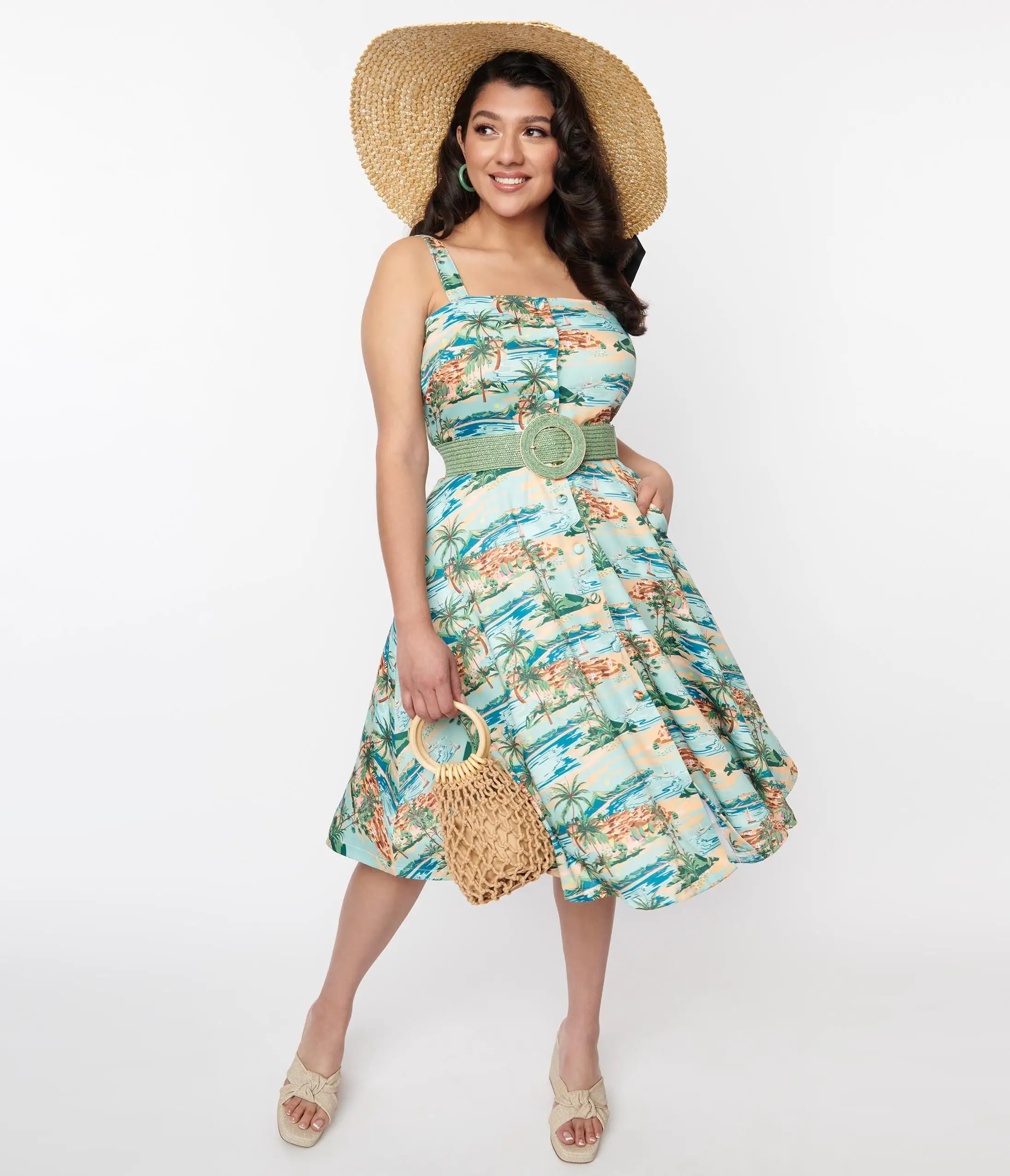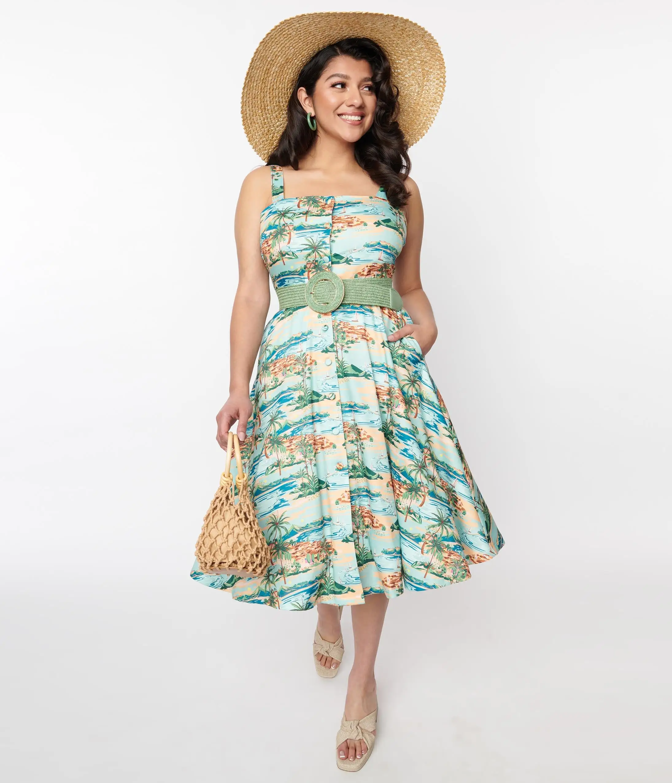 Whether it’s for a beach vacation or a summer picnic, this 1950s style teal button-down sleeveless swing dress from Voodoo Vixen is perfect! Featuring a stunning Riviera print that will turn heads, this dress also comes with side pockets for added convenience. Its flowy, swingy silhouette will keep you comfortable and looking chic all day long.