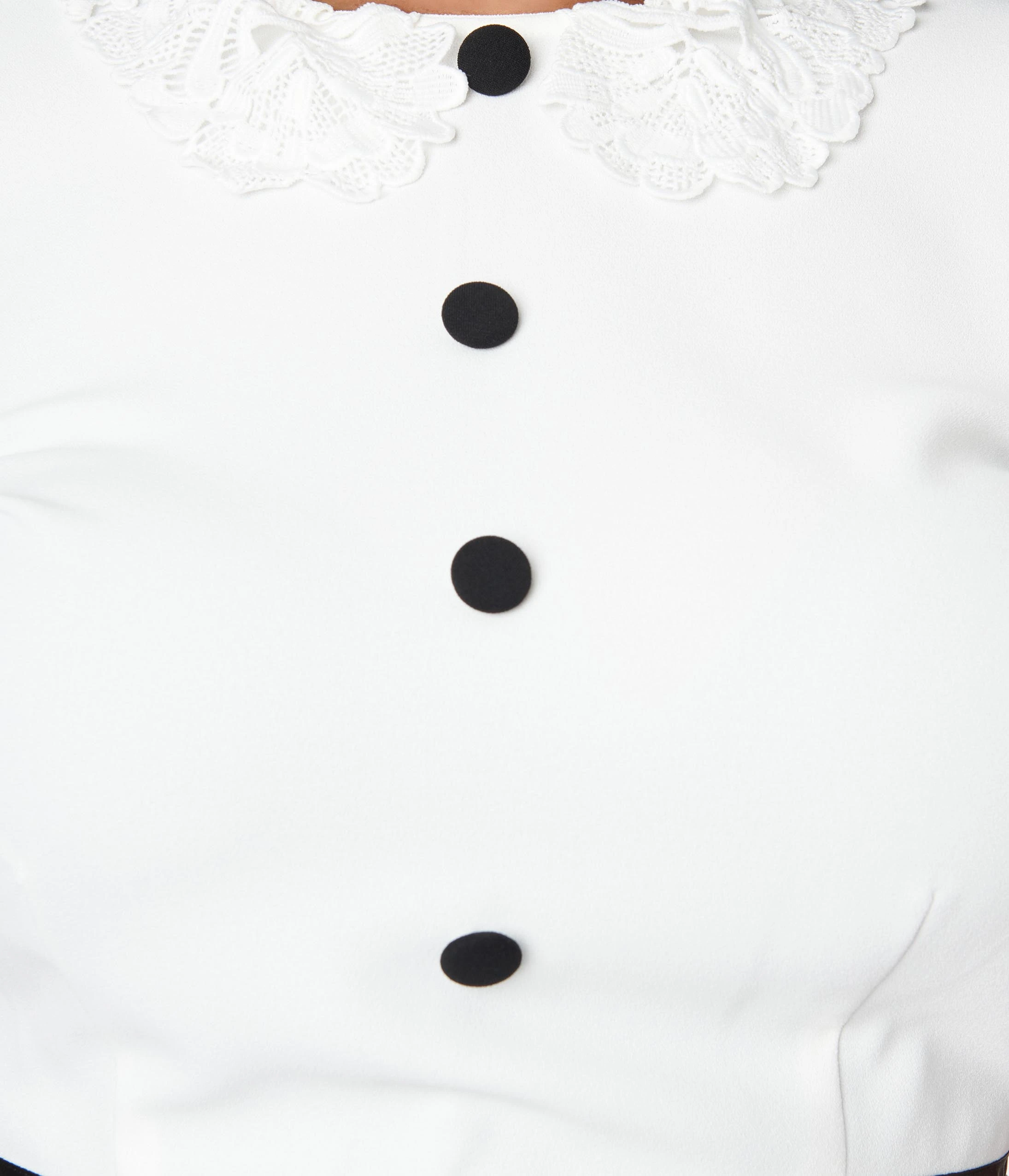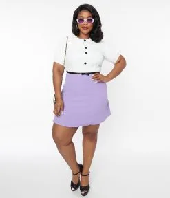 This charming 1960s style fit and flare dress is crafted in a white and purple contrast woven. Outfitted with a faux lace collar and faux partial button up, framed with cuffed short puff sleeves. Complete with a back zipper.