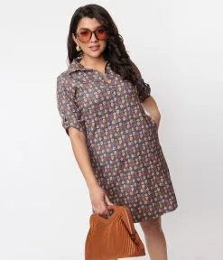 Upgrade your wardrobe with this stunning blue shift corduroy dress, featuring mod orange and brown florals that make a bold statement. Its short sleeves and collar design create a chic and polished look, making it perfect for any occasion. Complete with side pockets.