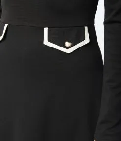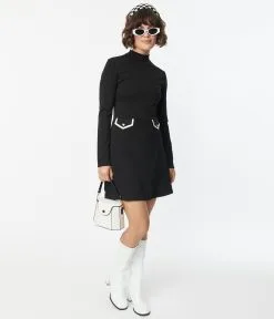 This retro style fit and flare dress is crafted in a black knit stretch fabric. The mock neck top is framed by long sleeves, while the mini length A-line skirt is accented with faux pockets complete with white piping and faux buttons.