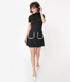 Dare to be bold, gals! A striking knit dress from Smak Parlour, the Wave Maker is a gorgeous black frock full of 1960s vibes. The darted bodice is topped by a mock turtleneck and framed by sleek short sleeves while the tapered waist drops into a darling A-line skirt that dances above the knees and is outfitted with white piped embellished side pockets. Complete with a button back keyhole, flip some boats with your style!
