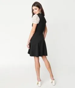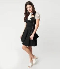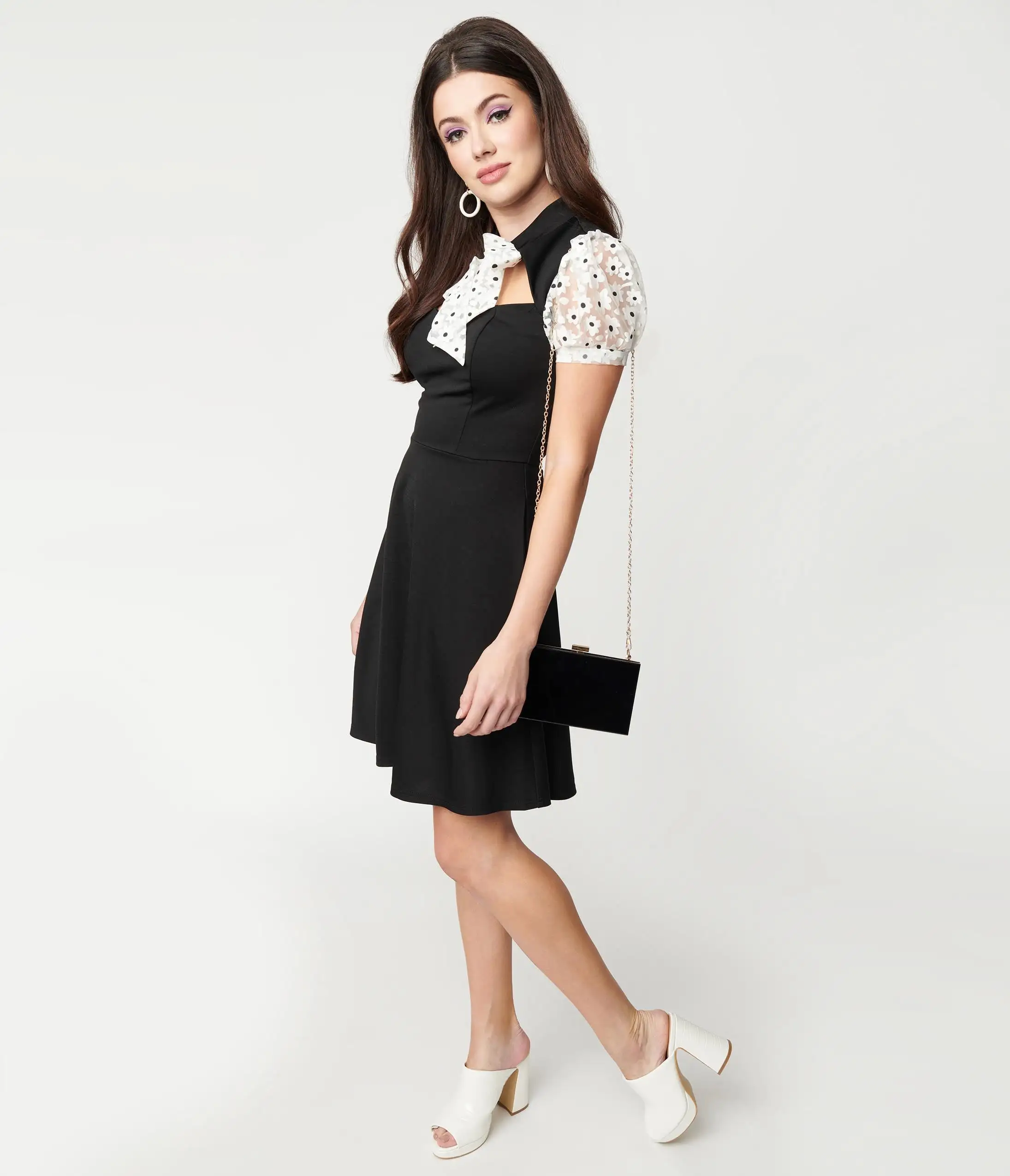 This sweet flare dress is crafted in a black stretch knit fabric accented with white floral burnout mesh sleeves and self tie collar bow keyhole. Complete with back zipper and side pockets!
