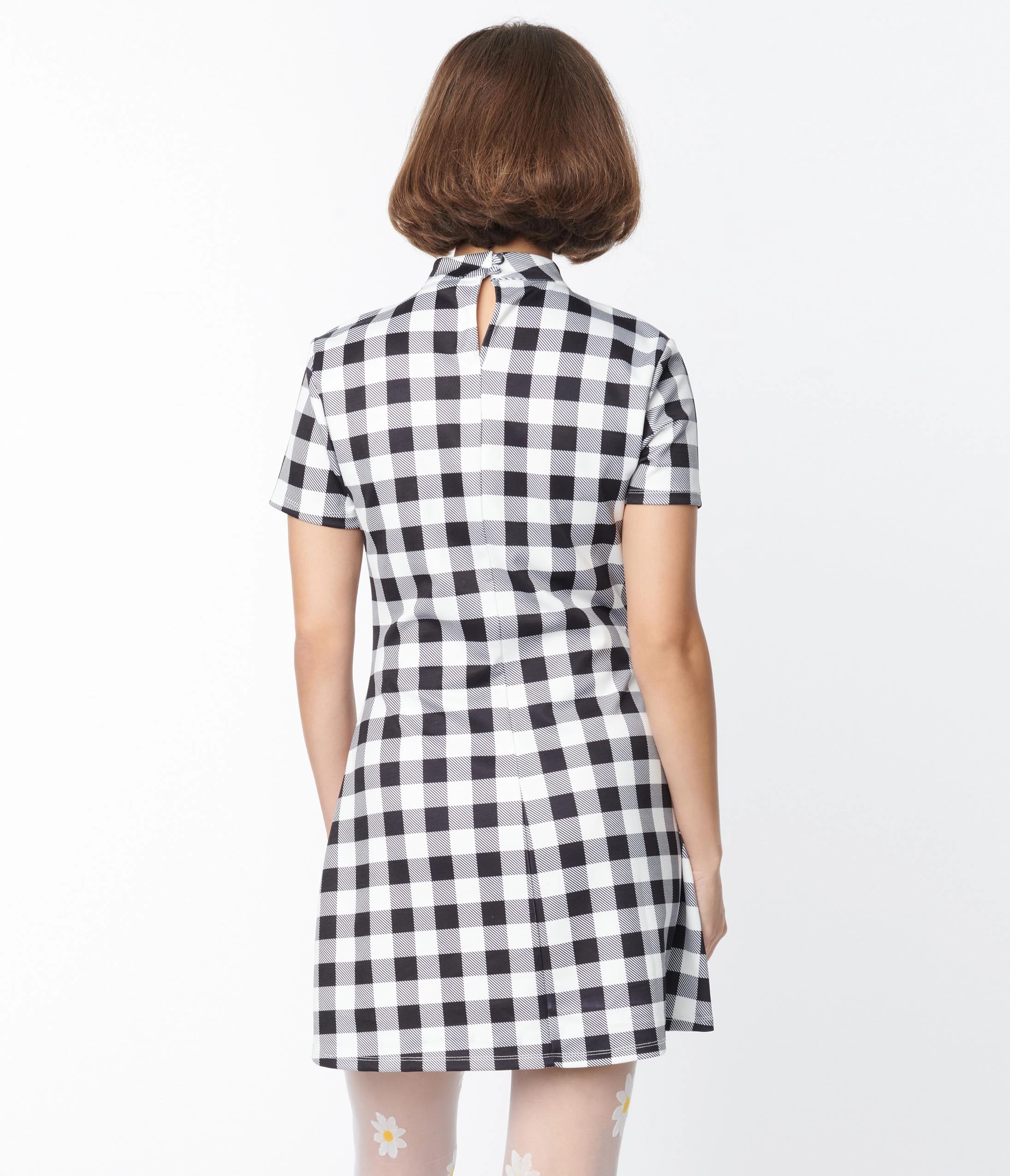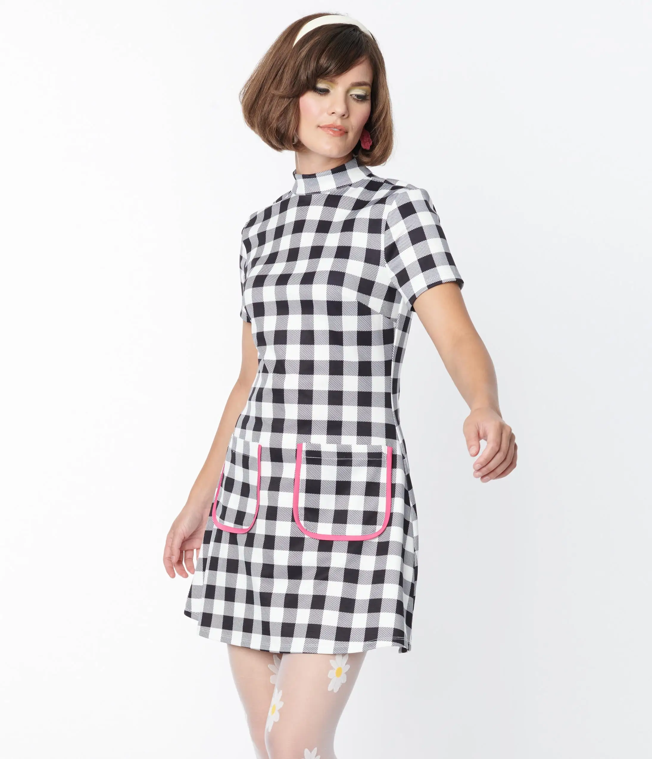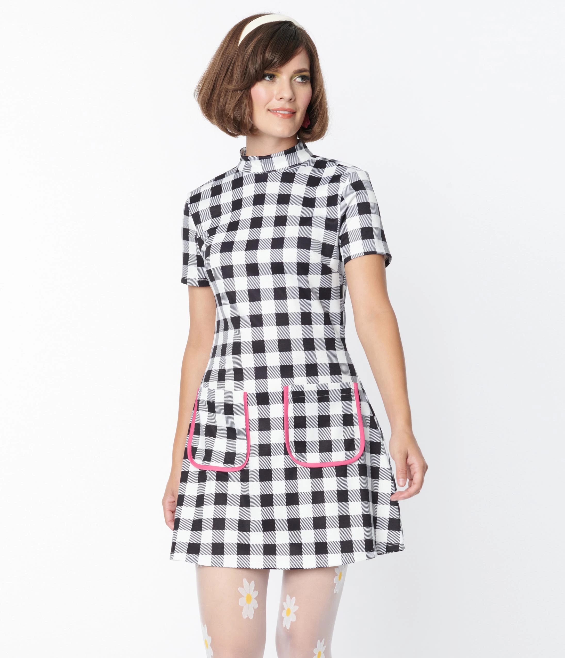 A striking knit dress crafted in a gorgeous black and white gingham. The darted bodice is topped by a mock turtleneck and framed by short sleeves while A-line skirt is outfitted with patch pocketed accented with pink piping!