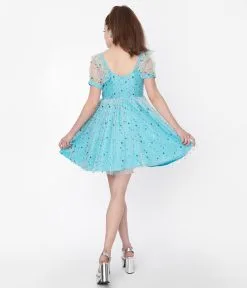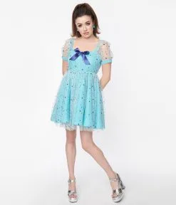 This dazzling babydoll dress from Smak Parlour is crafted in a light blue mesh and sparkles with multicolor glitter stars printed throughout an aqua blue lining. The high empire waist is cinched with a back zipper while the scoop neckline is framed by short puff sleeves. Complete with a navy blue bow attached on the front!