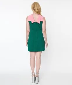 This sultry mini dress is crafted in a color blocked knit of an emerald green silhouette and pink yoke, complete with daisy patch pockets. Outfitted with a back zipper.