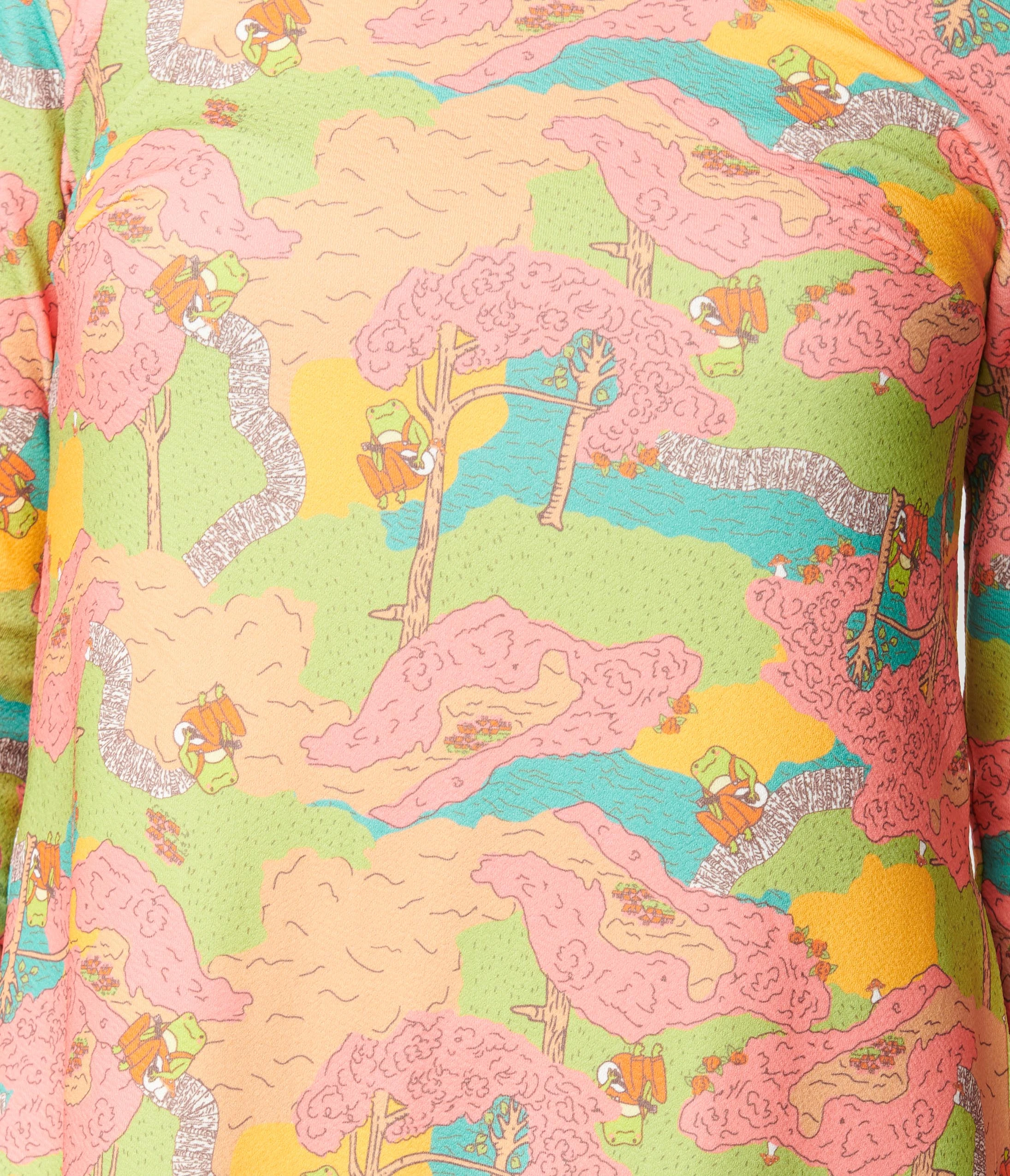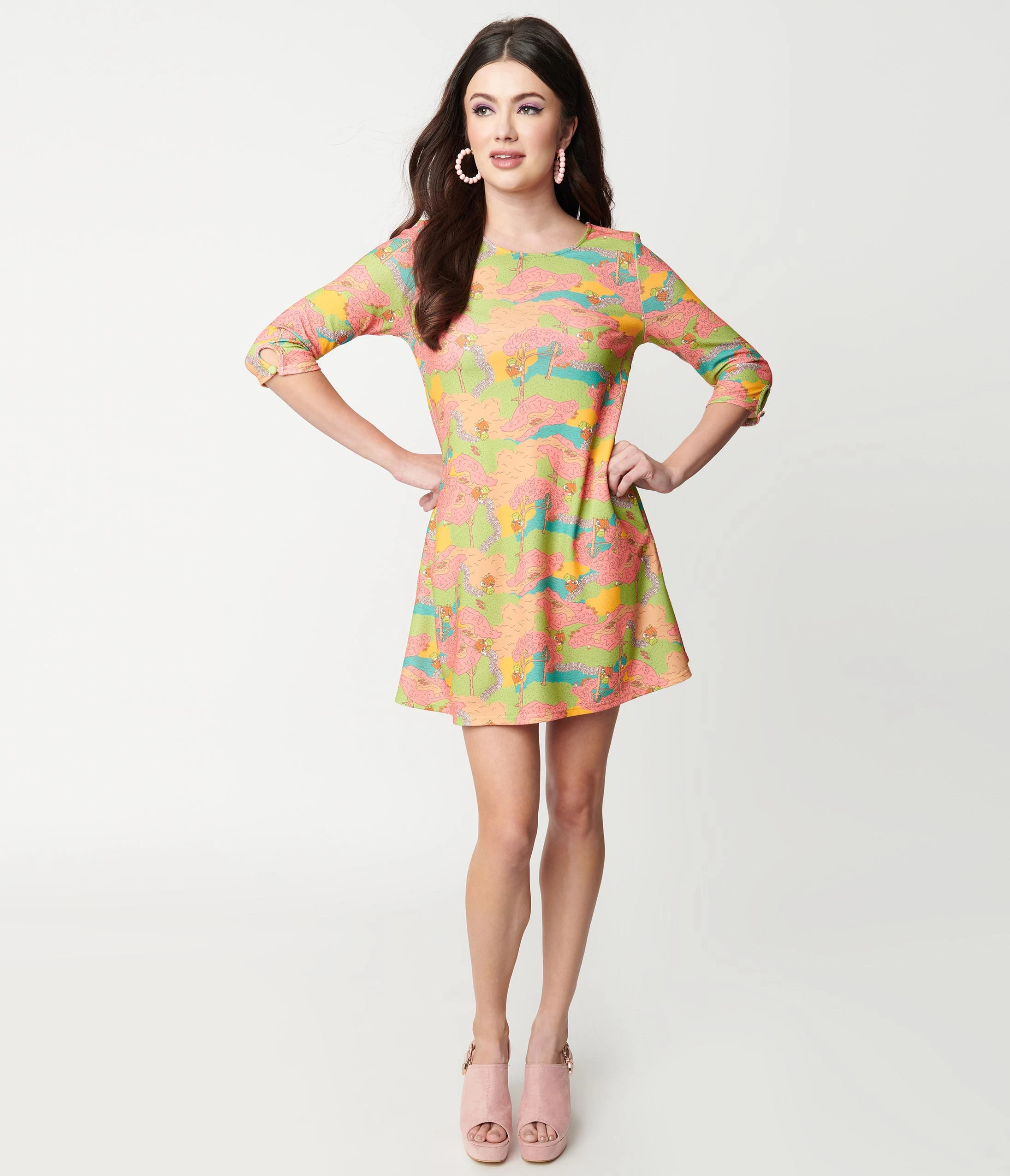 This sweet shift dress is crafted in a stretchy knit fabric, and features an adorable groovy frog in the park print throughout. The modest scoop neckline is secured with a button back keyhole while the relaxed silhouette drops to a high hemline. Complete with side pockets!