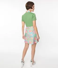 This adorable 1960s mini dress is crafted in a knit fabric and features a paisley print in shades of green, blue, pink, and orange. The partial button front leads to a solid green top framed by short sleeves. The woven skirt drops from the seamed waist features side pockets and is secured by the side zipper.
