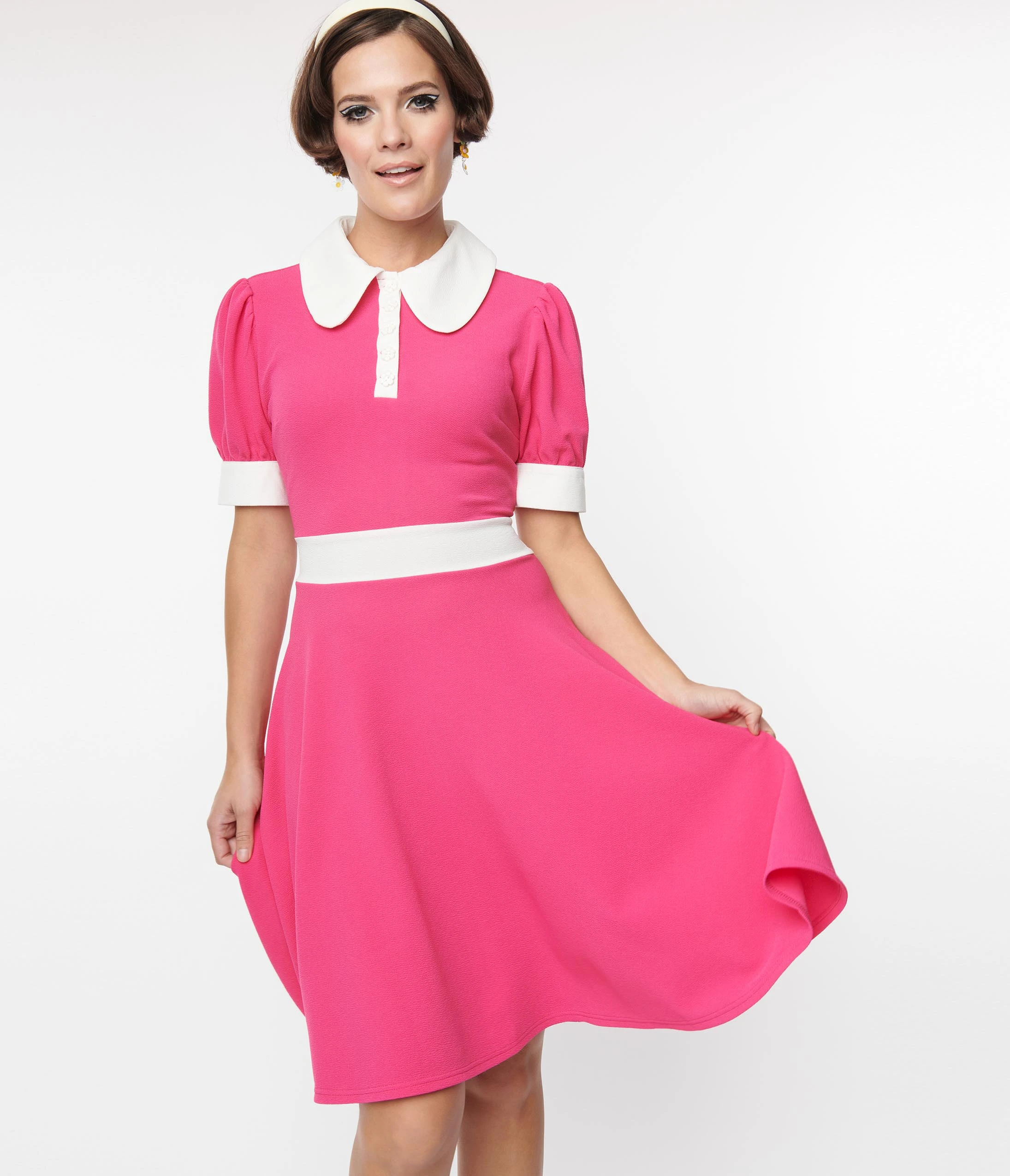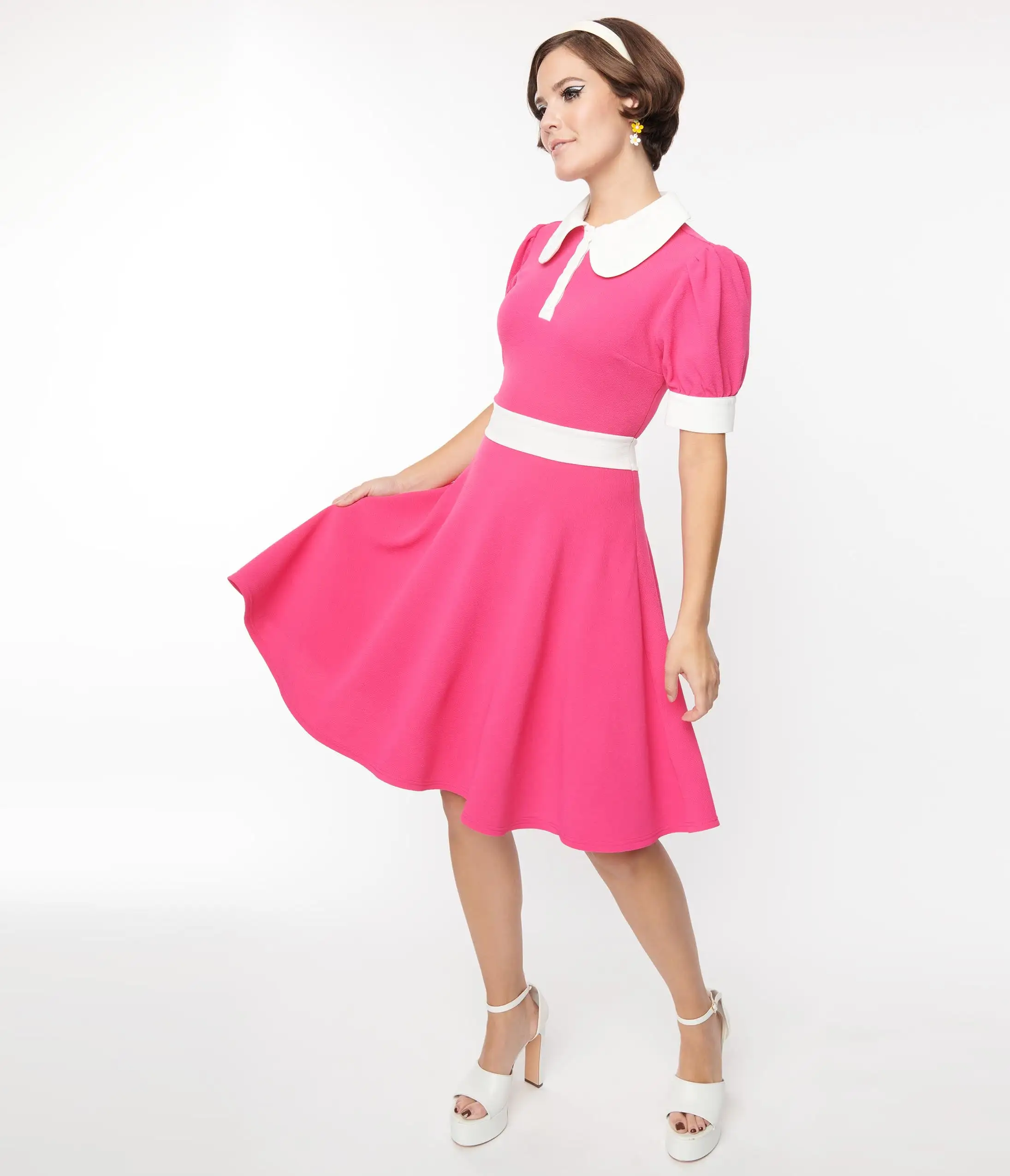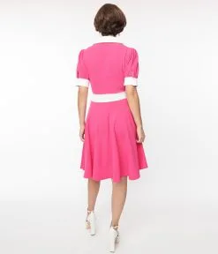 This sweet flare dress is crafted in a hot pink knit blend and white contrast. Outfitted with a side zipper, a partial button up front, and a charming short sleeves.