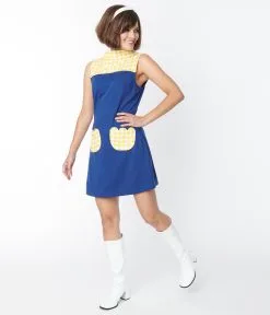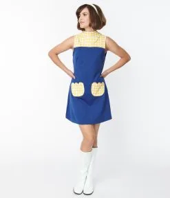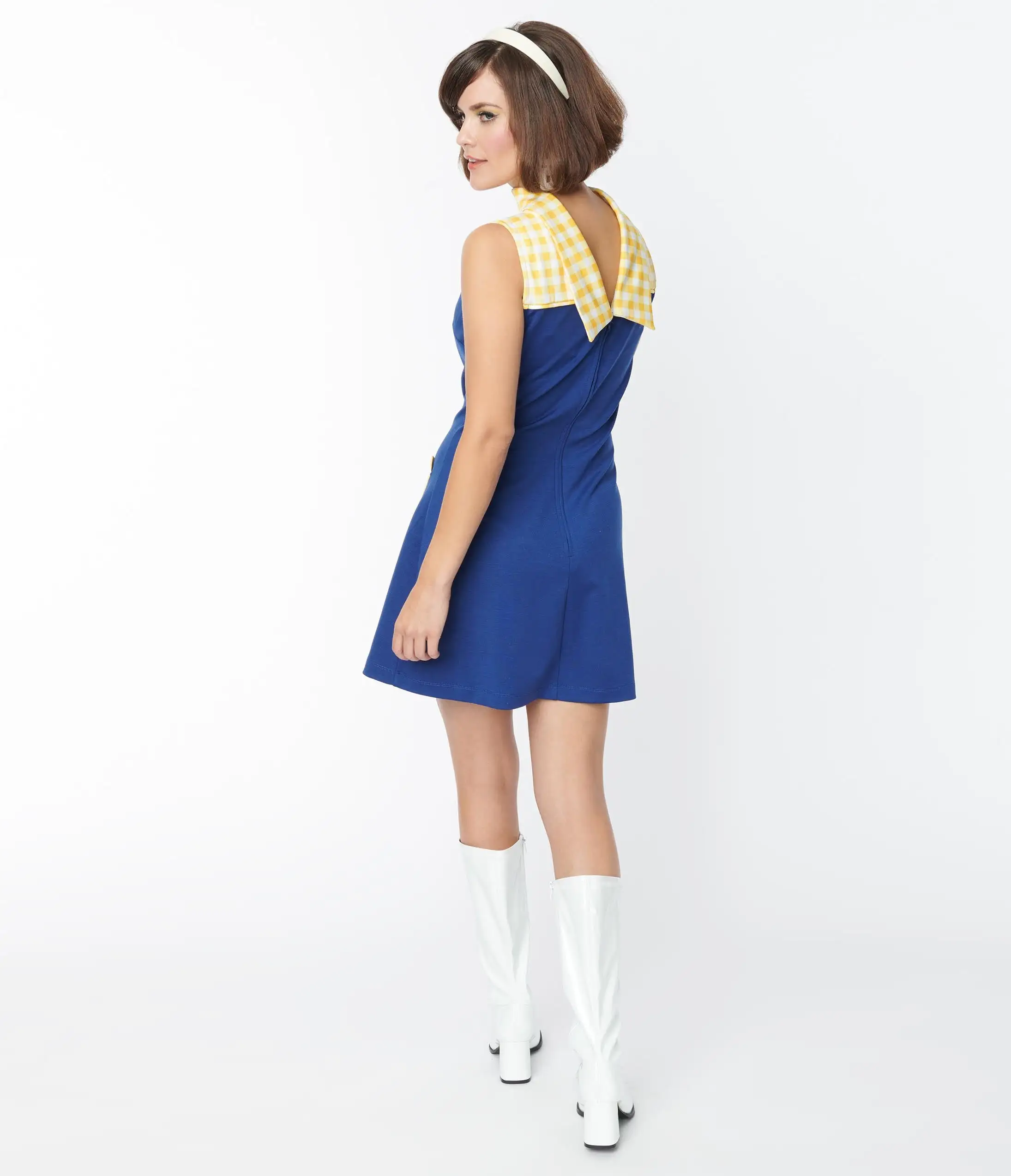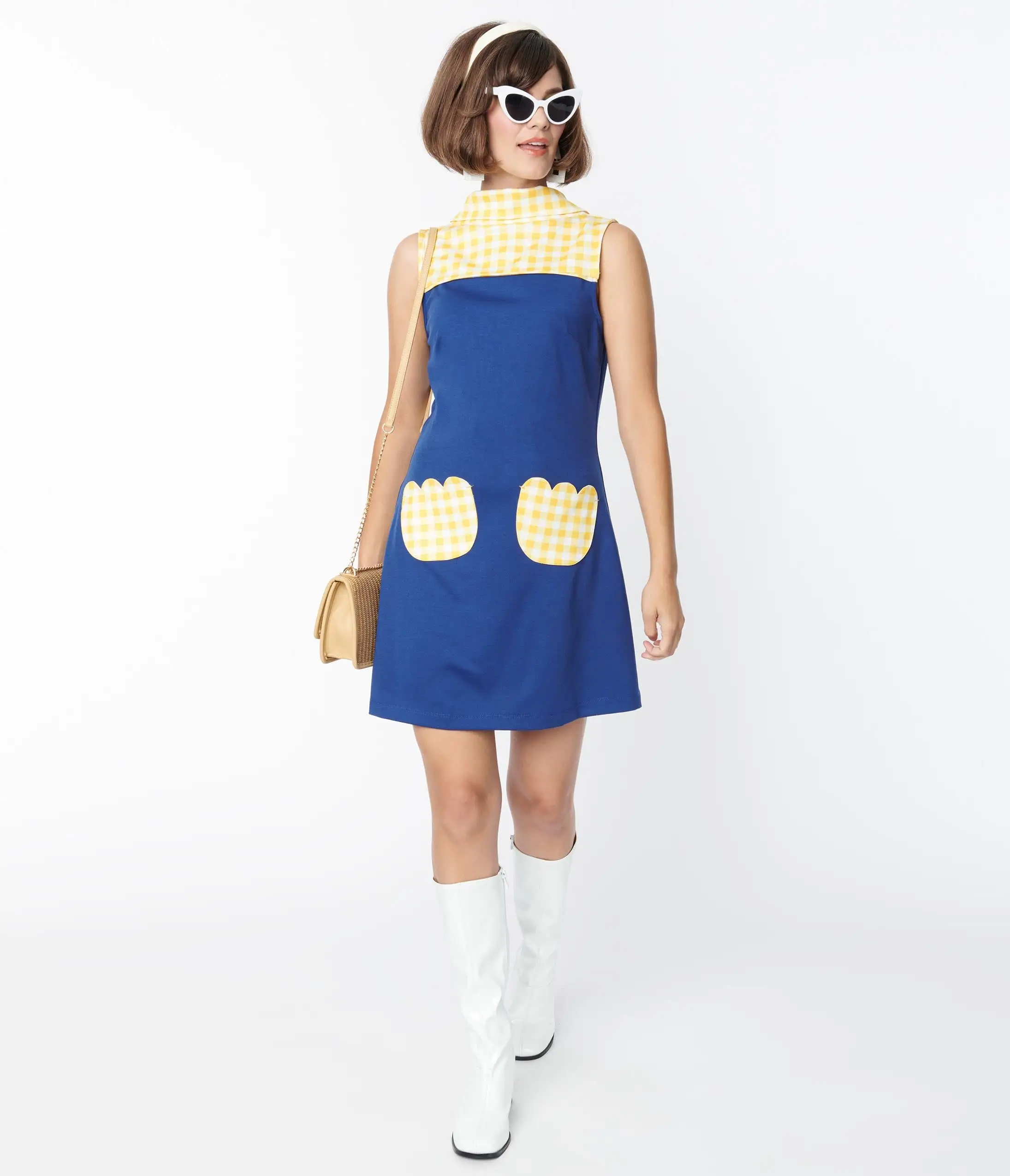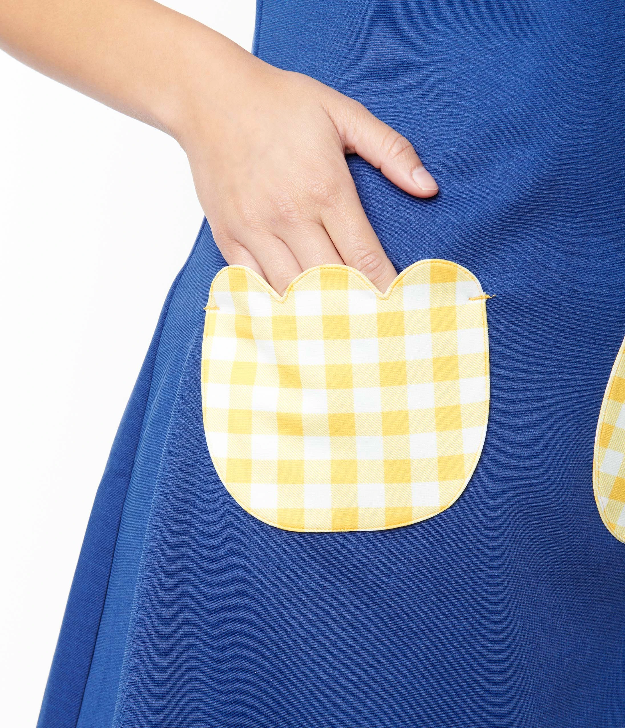 This sultry mini dress is crafted in a color blocked knit of a navy blue silhouette and yellow gingham yoke, complete with yellow gingham tulip shaped patch pockets. Outfitted with a back zipper.