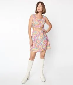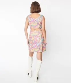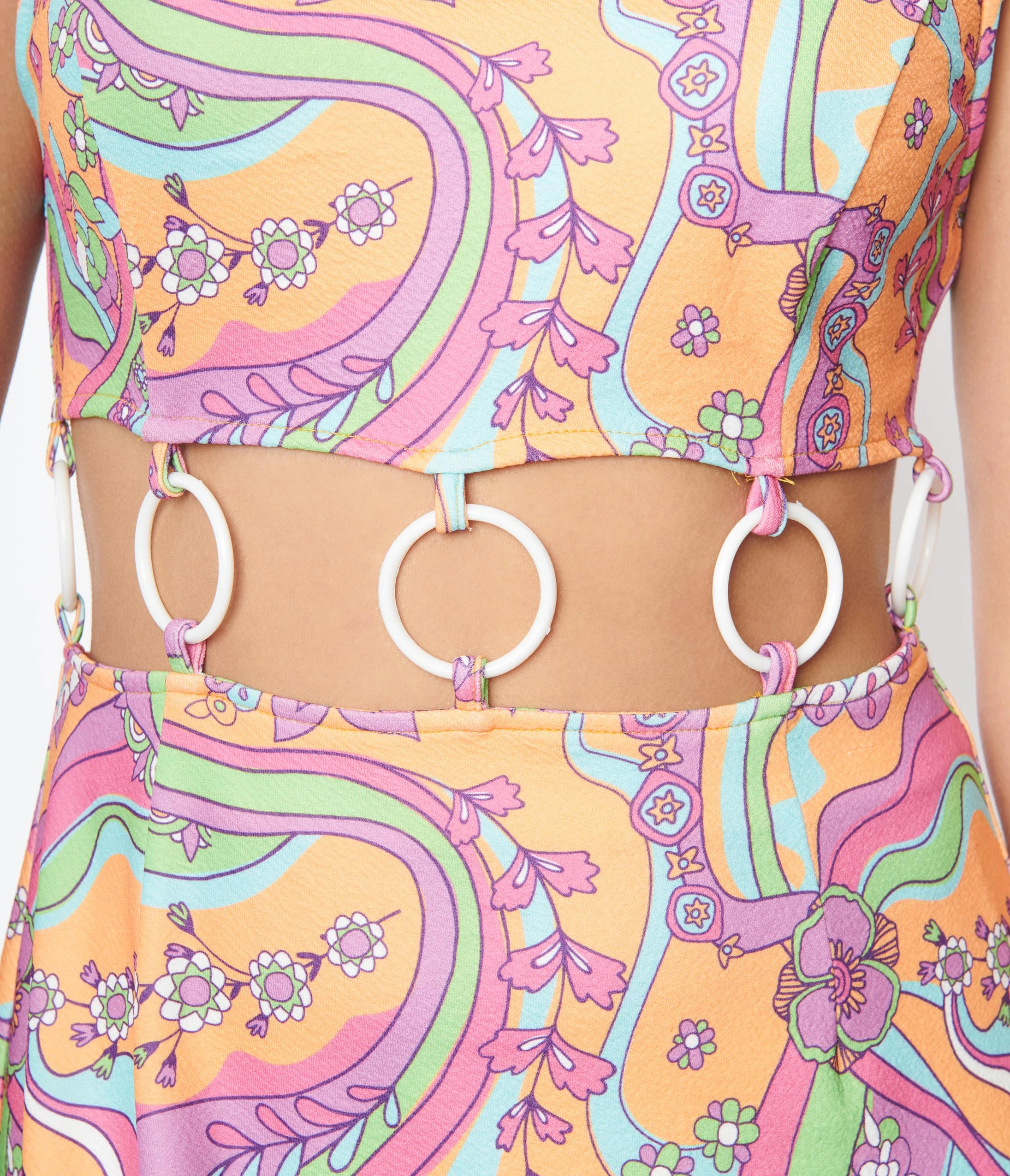 This groovy 1960s inspired piece is crafted in a marvelous stretch blend that dazzles with an eye-catching psychedelic print of daisies and wavy patterns throughout the orange backdrop. The princess seamed bodice is topped by a scoop neckline and framed with a sleeveless design. A dynamite cutout waist is embellished with ivory hoops for an eye-catching accent while the flare skirt dances above the knees!