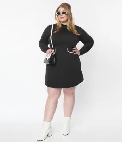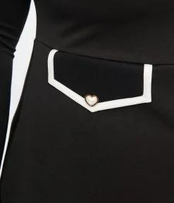 This retro style plus size fit and flare dress is crafted in a black knit stretch fabric. The mock neck top is framed by long sleeves and cinched with a back zipper and buttons, while the mini length A-line skirt is accented with faux pockets complete with white piping and faux buttons.