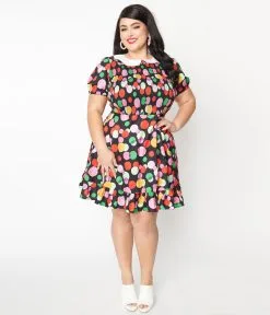 This charming 1960s inspired plus size mini dress is crafted in a lightweight woven fabric that dances with a bevy of rainbow colored dots throughout the black backdrop. The smock front bodice is outfitted with an adorable white Peter Pan collar. The flare skirts drop from the seamed waist and boast side pockets!