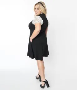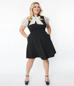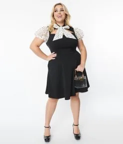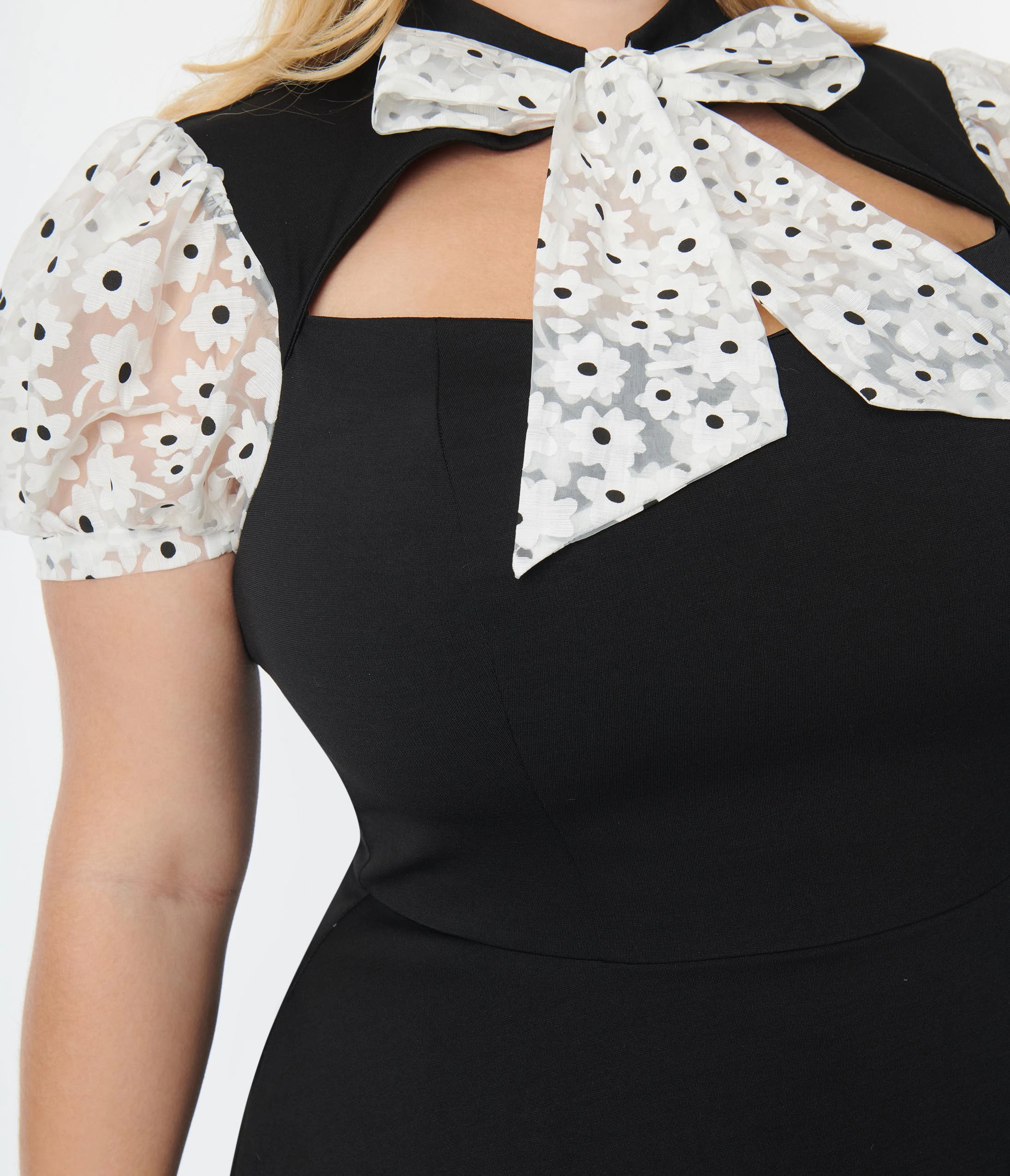 This sweet flare dress is crafted in a black stretch knit fabric accented with white floral burnout mesh sleeves and self tie collar bow keyhole. Complete with back zipper and side pockets!