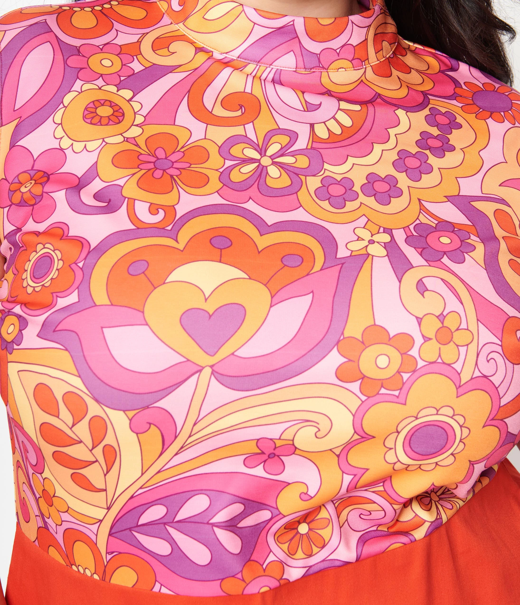 An adorable plus size shift dress crafted in a stretch knit blend on the bodice and a sturdy woven fabric on the skirt. Boasting a bold orange color block skirt and a pink retro floral print bodice. Cinched with a back zipper and button while side pockets complete this silhouette.