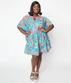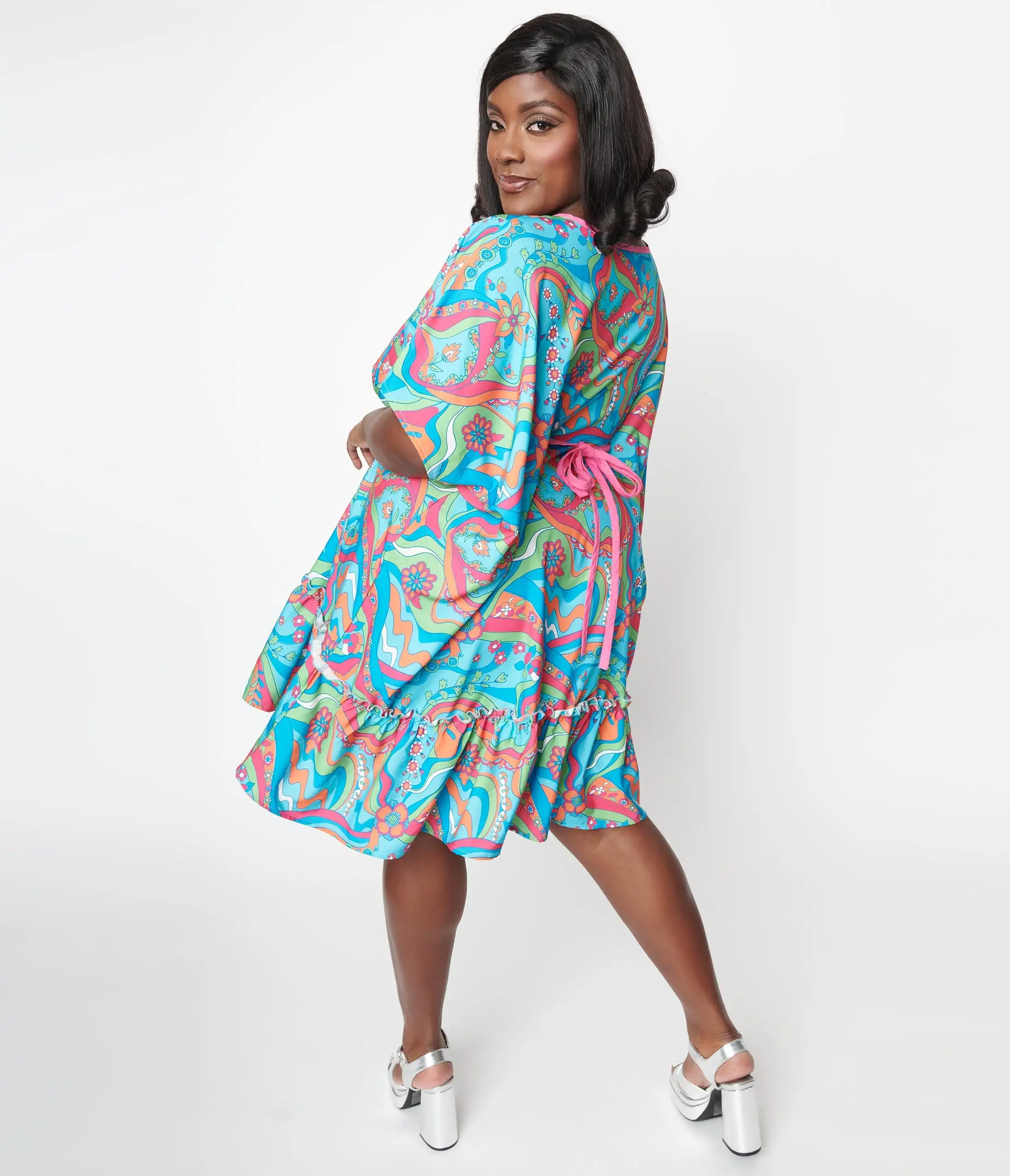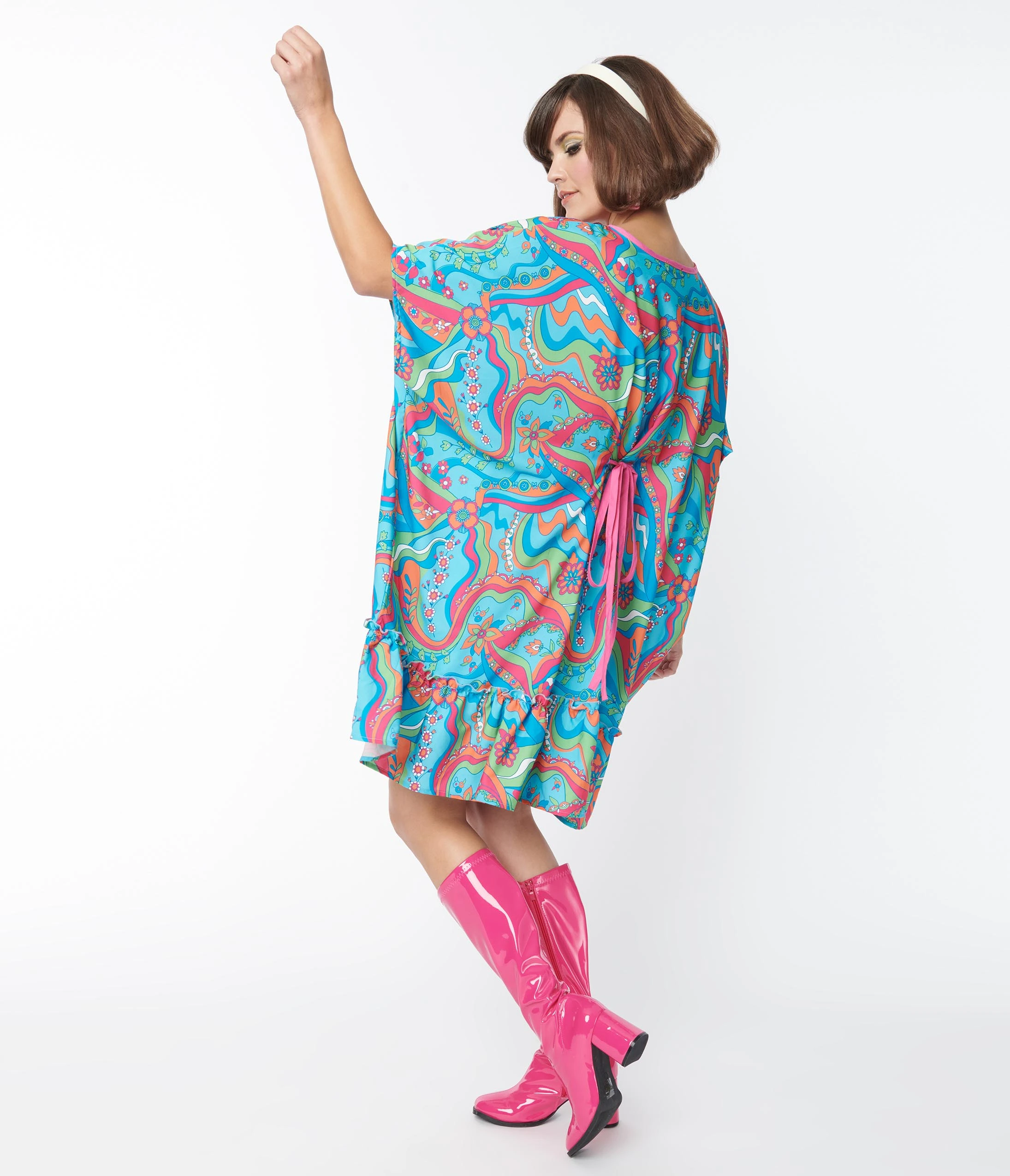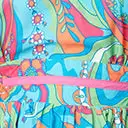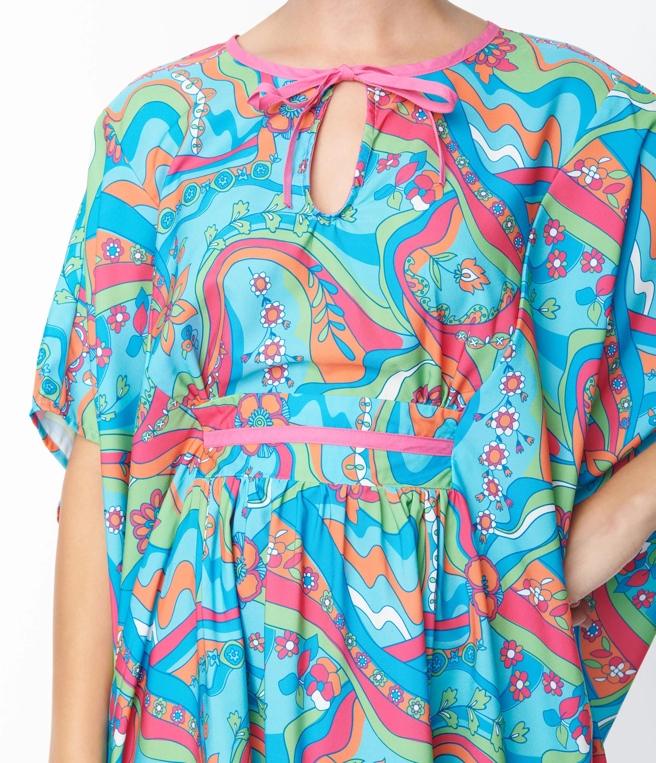 This sweet mini caftan dress is crafted in a psychedelic daisy river print in shades of blue, green and pink. Attached waist ties provide a flattering cinch and is complete with short sleeves and a self tie front keyhole.