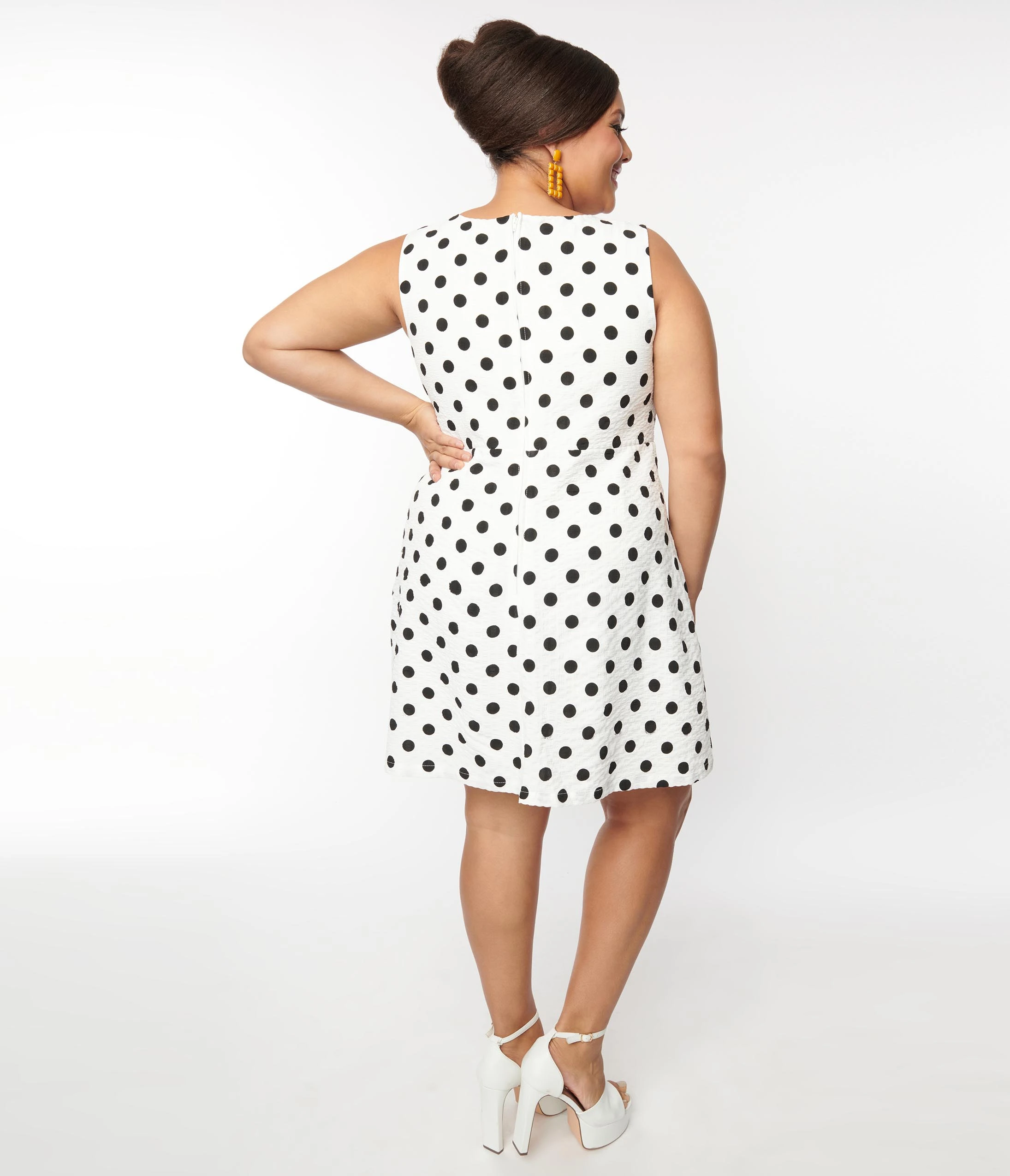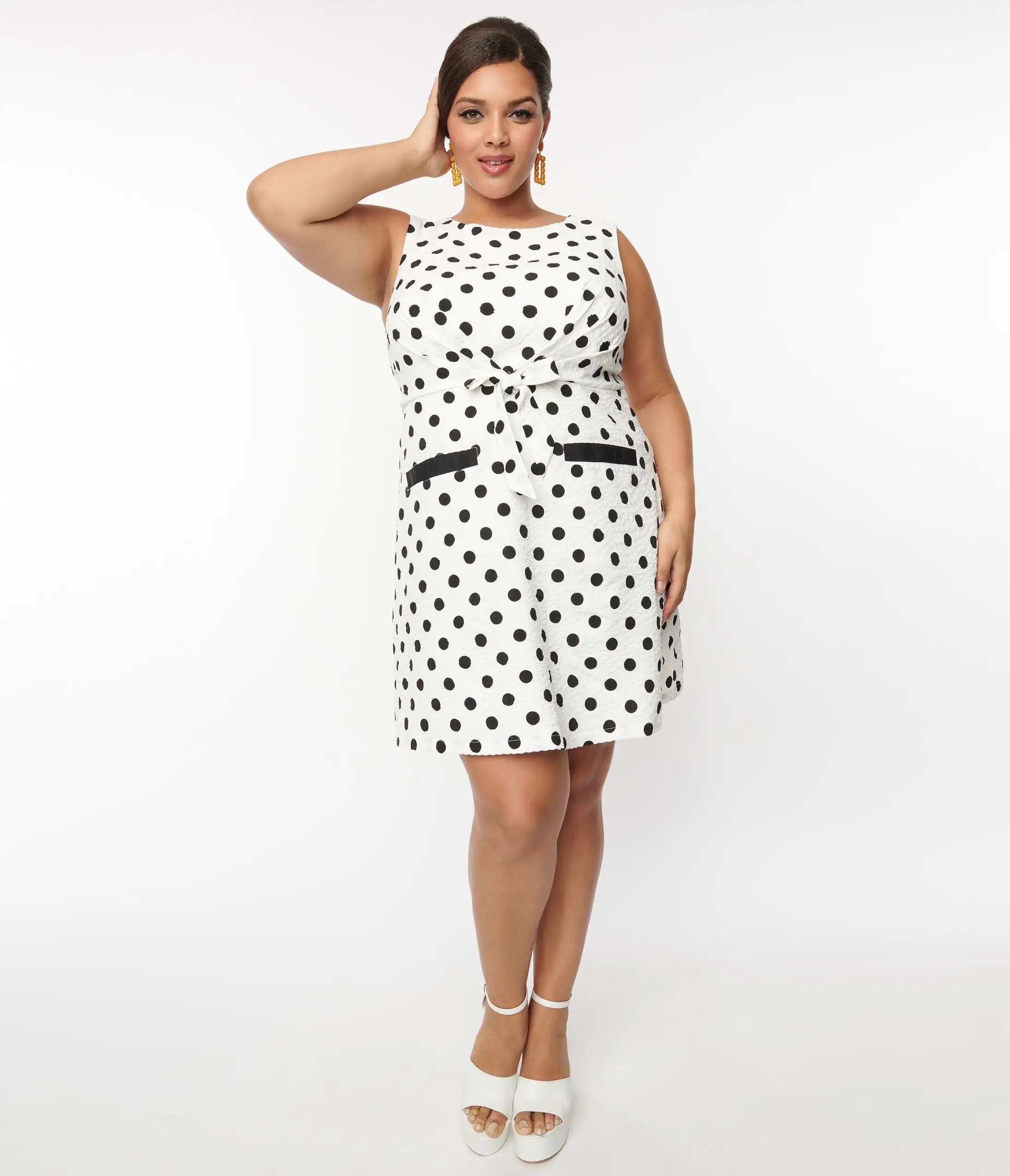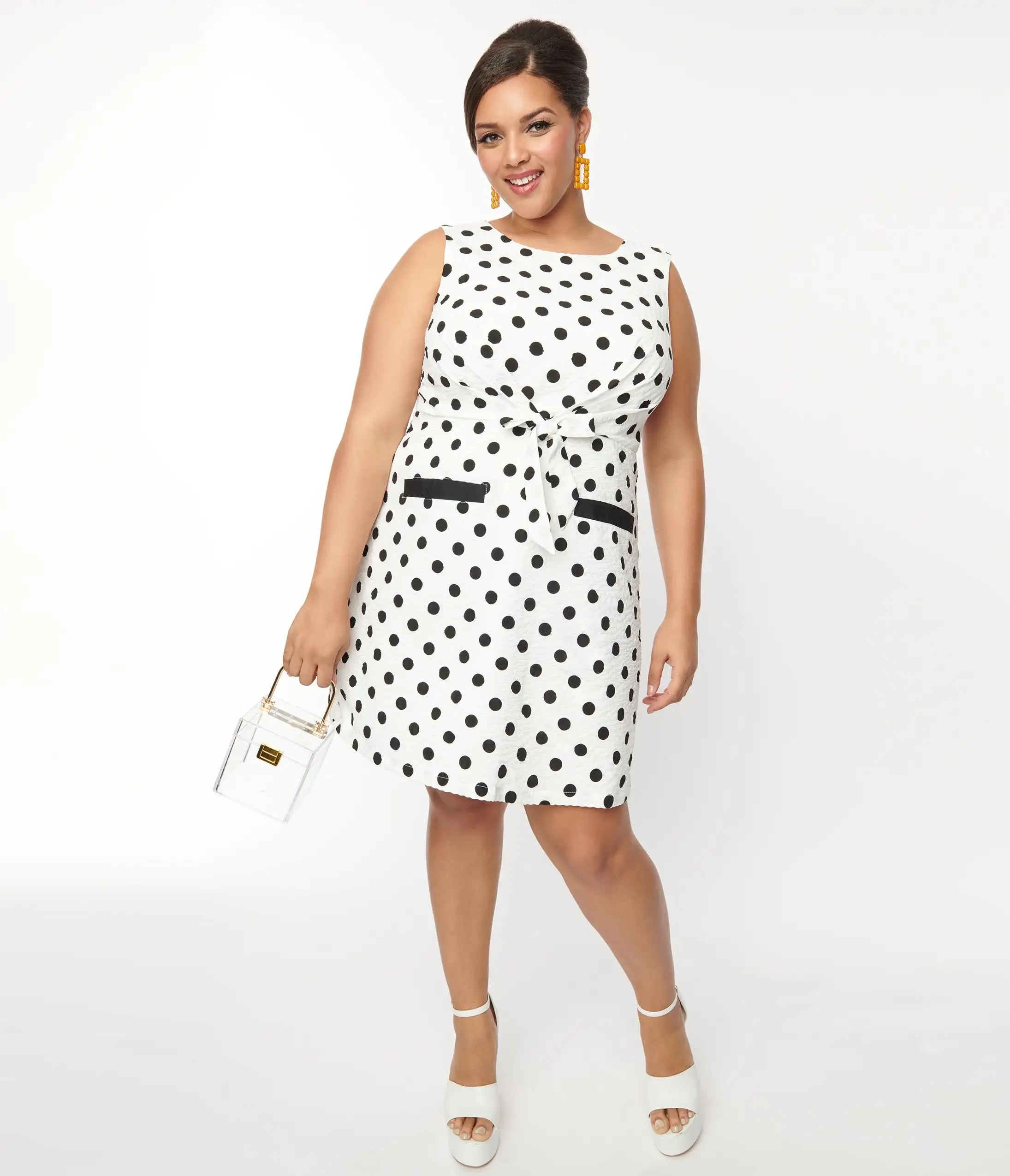 This charming 1960’s inspired shift dress is crafted in a beautiful white woven crepe and features black polka dots throughout. This sleeveless style features an A-line skirt that drops to a straight hem above the knees and is complete with a faux tie bow front bodice.
