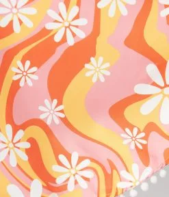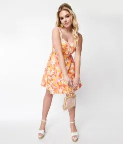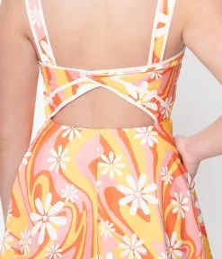 This adorable 1960’s style swing dress from Smak Parlour is crafted in a lightweight woven fabric and dances with a fabulous pink and orange psychedelic florals throughout the yellow backdrop. The scoop neckline is secured by thick shoulder straps while the back features a fun cutout detail. Complete with white pompoms on the hem, side zipper and side pockets.