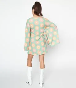 This flirtatious piece in collaboration with Smiley® is crafted in a knit that boasts daisies with Smiley® centers cascading throughout a mint green backdrop. The wide scoop neckline is framed by jaw-dropping long angel sleeves.