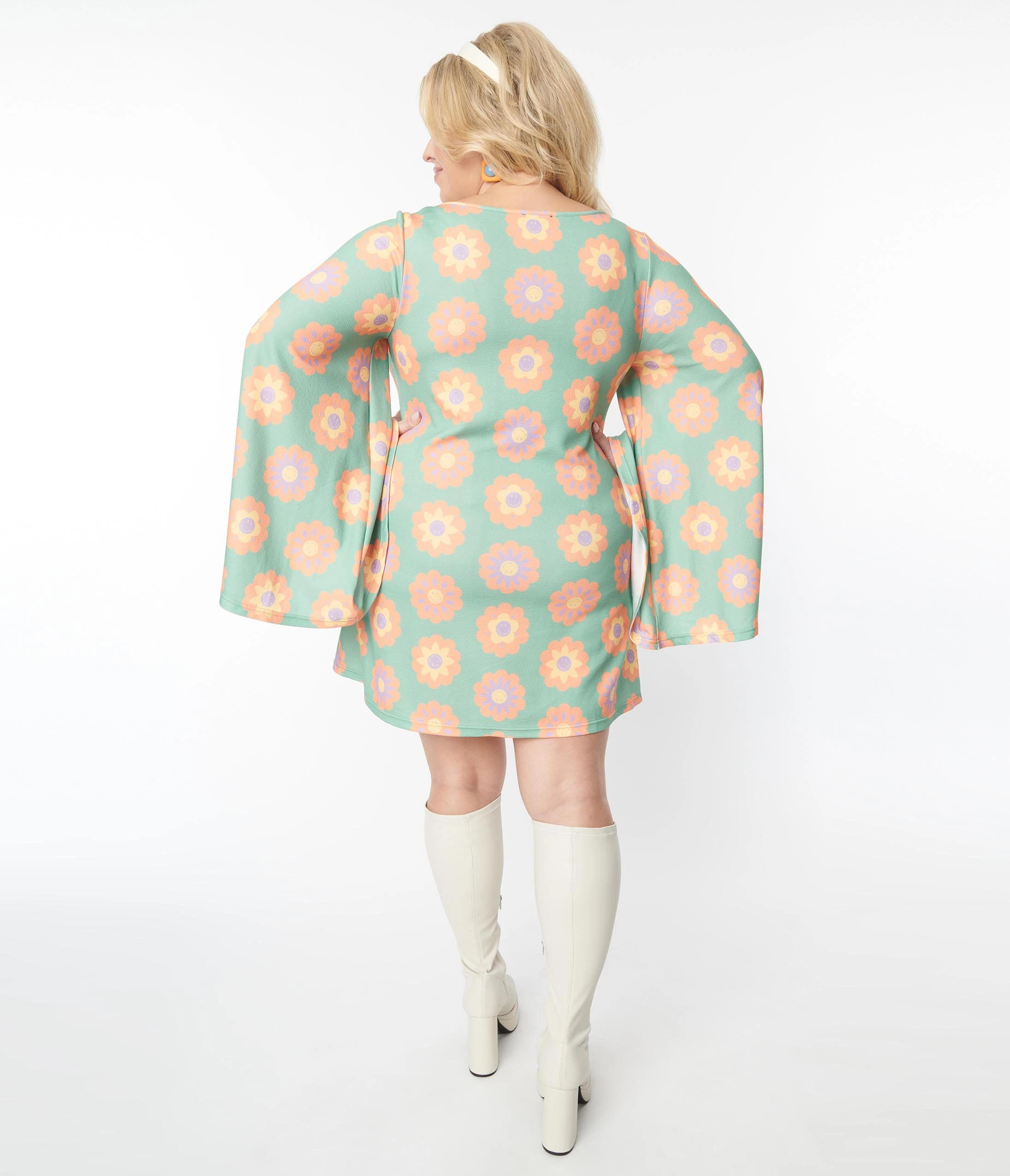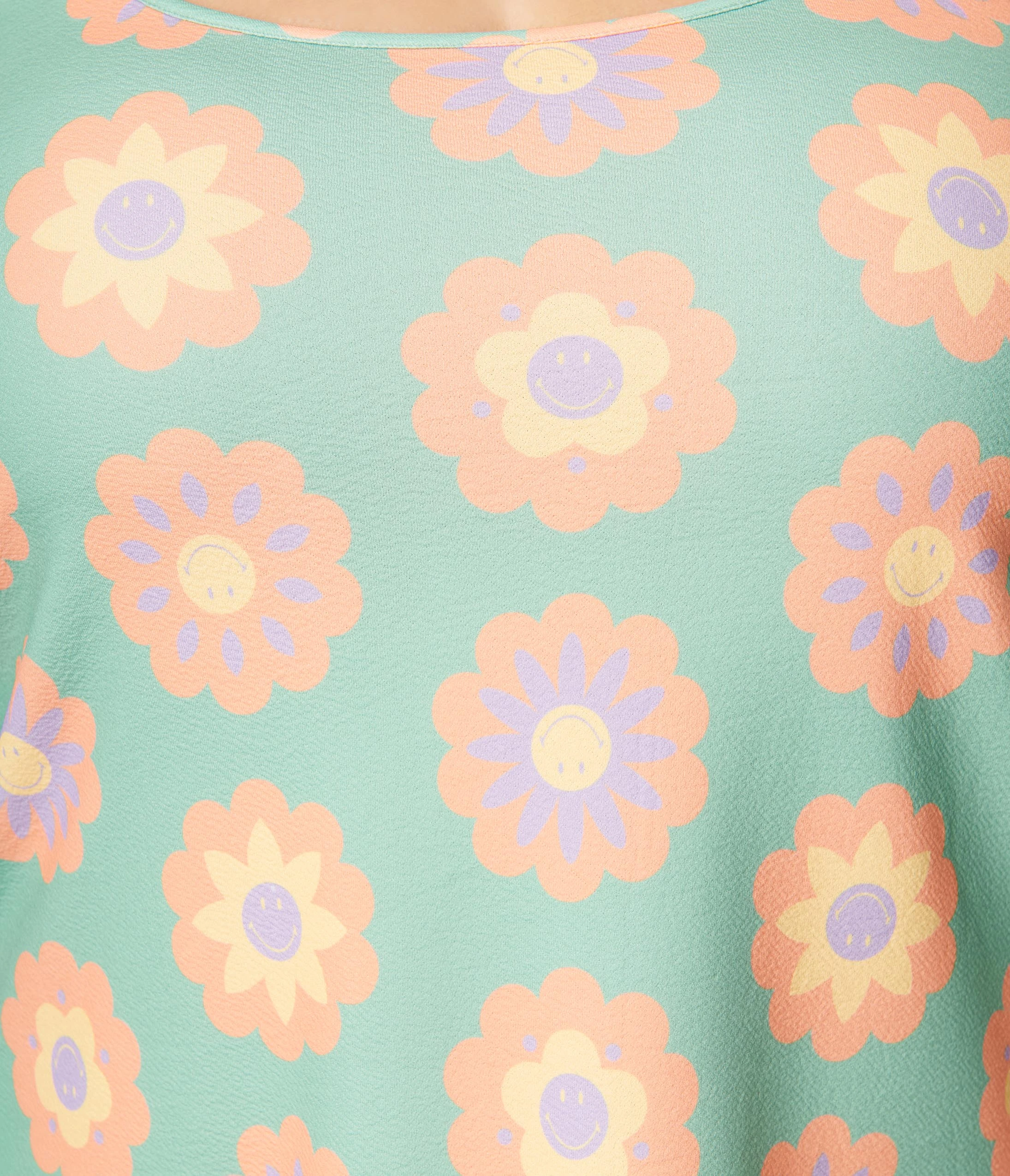 This flirtatious plus size piece in collaboration with Smiley® is crafted in a knit that boasts daisies with Smiley® centers cascading throughout a mint green backdrop. The wide scoop neckline is framed by jaw-dropping long angel sleeves.