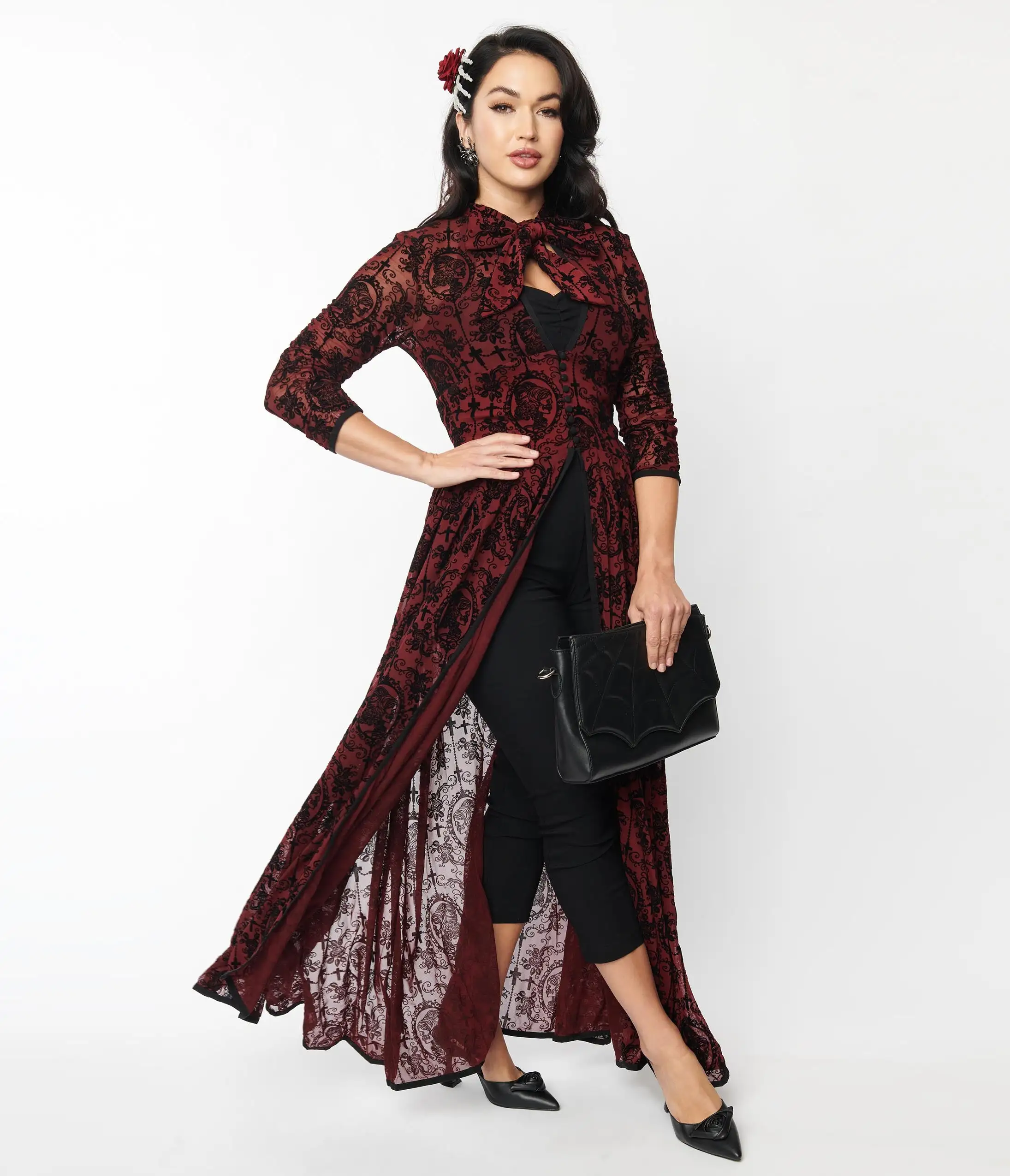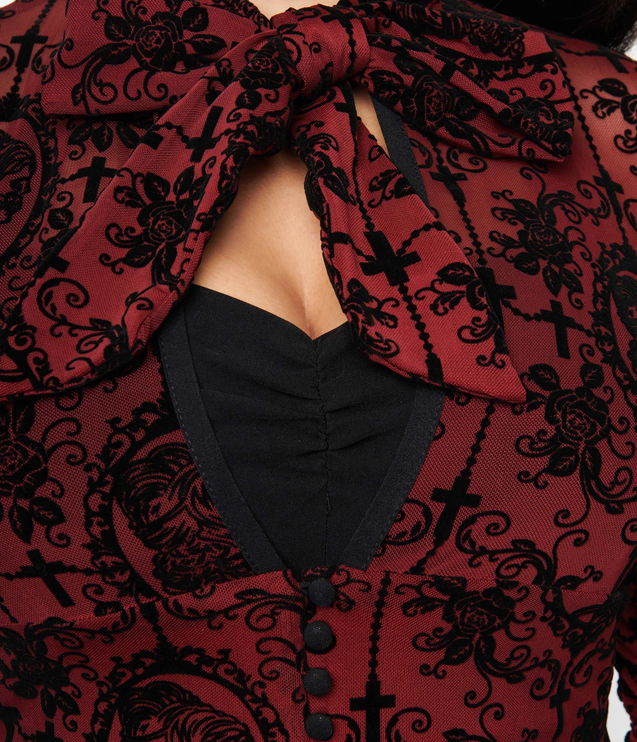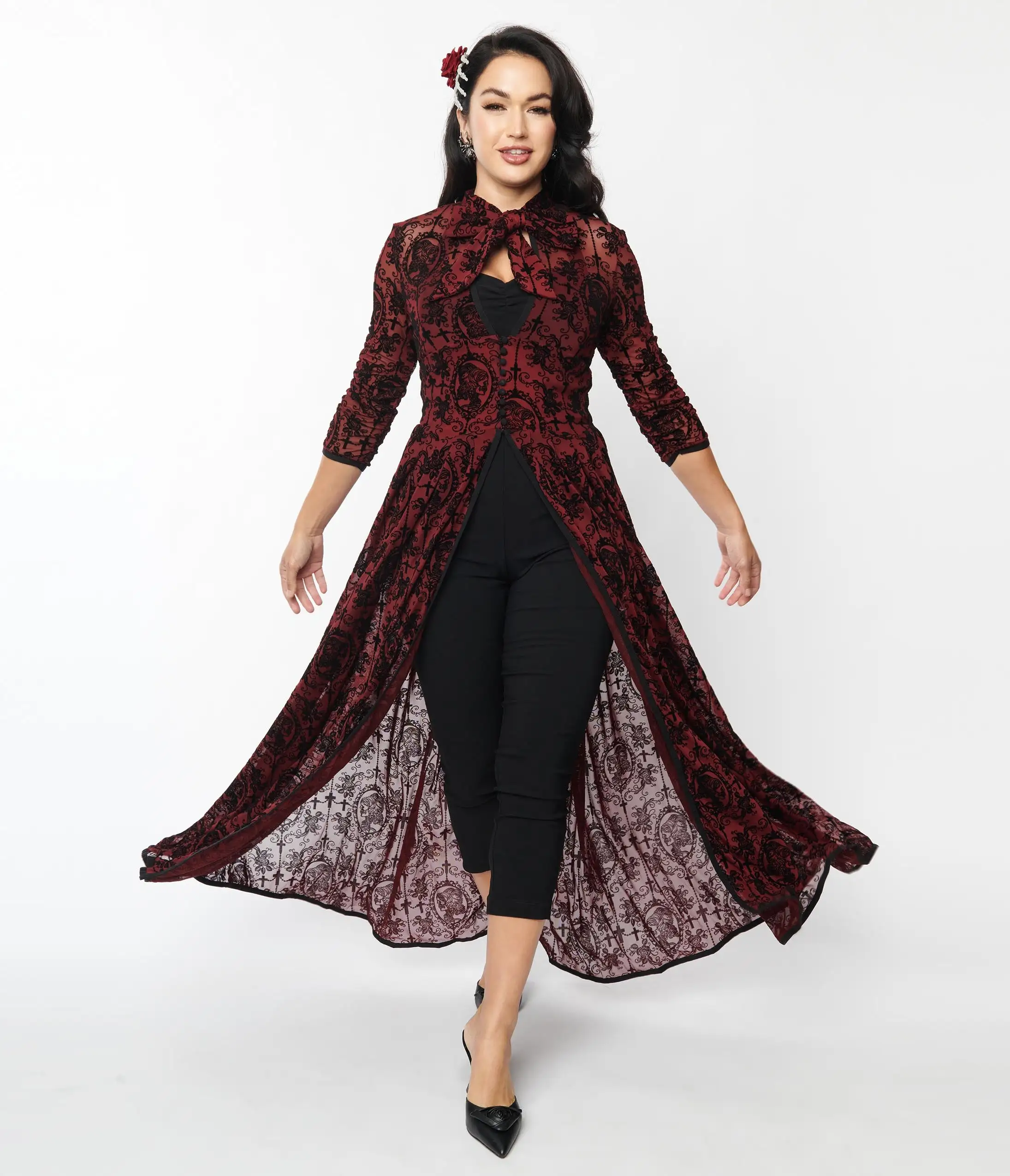 This dramatic duster is crafted in a beautiful burgundy and black burnout velvet with a skeletal cameo, roses, and crosses throughout. Complete with a self tie neck bow and button waist. Pair with a jumpsuit for a jaw-dropping opening act!