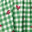 This adorable 1950s style swing dress is crafted in a smooth woven fabric that dances with charming ladybugs and florals throughout the green gingham backdrop. The self tie halter is framed by the sleeveless silhouette, while the full swing skirt is cinched by a red belt.