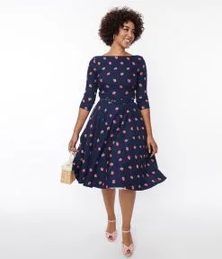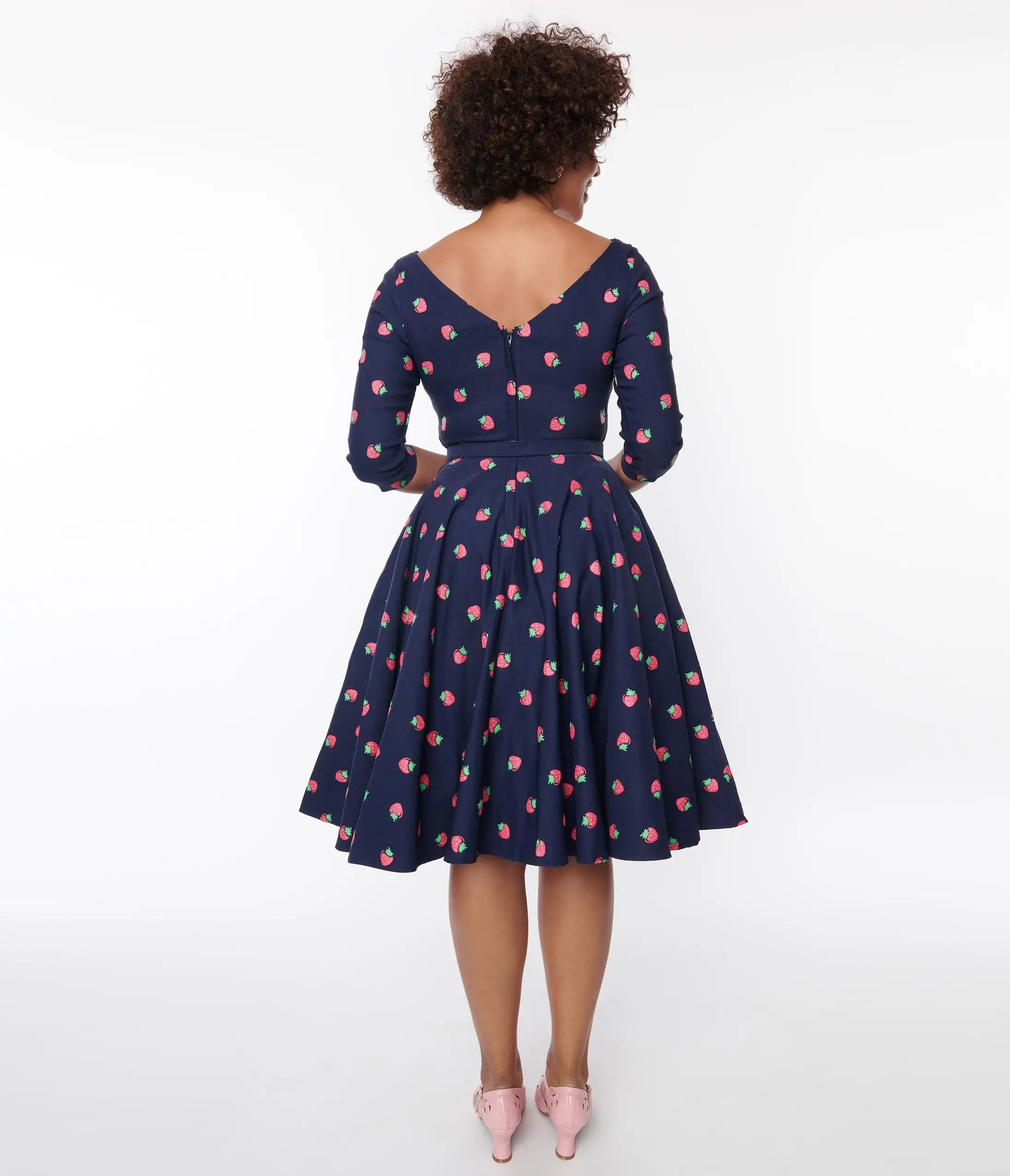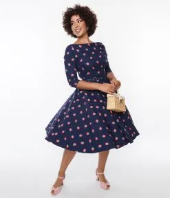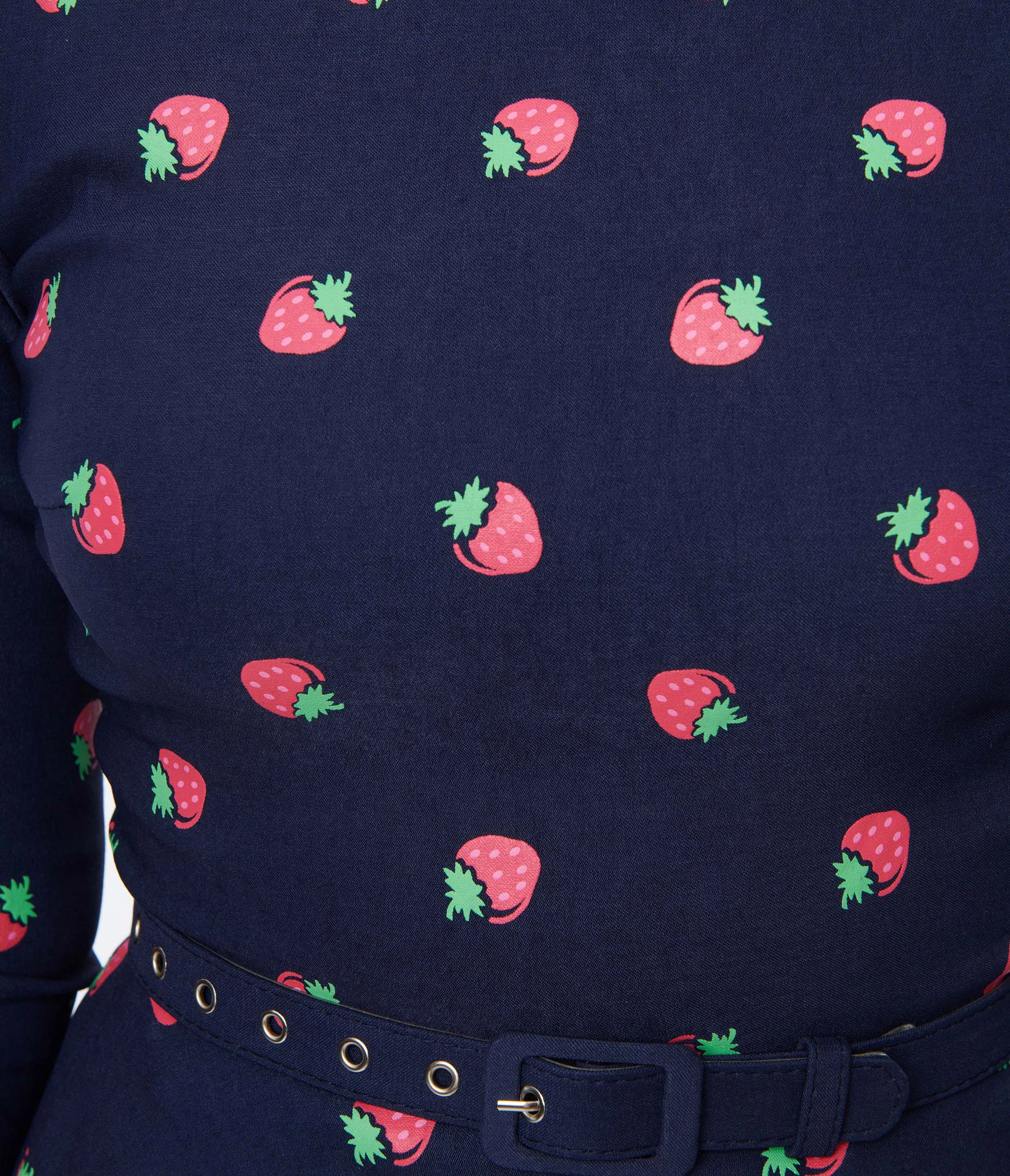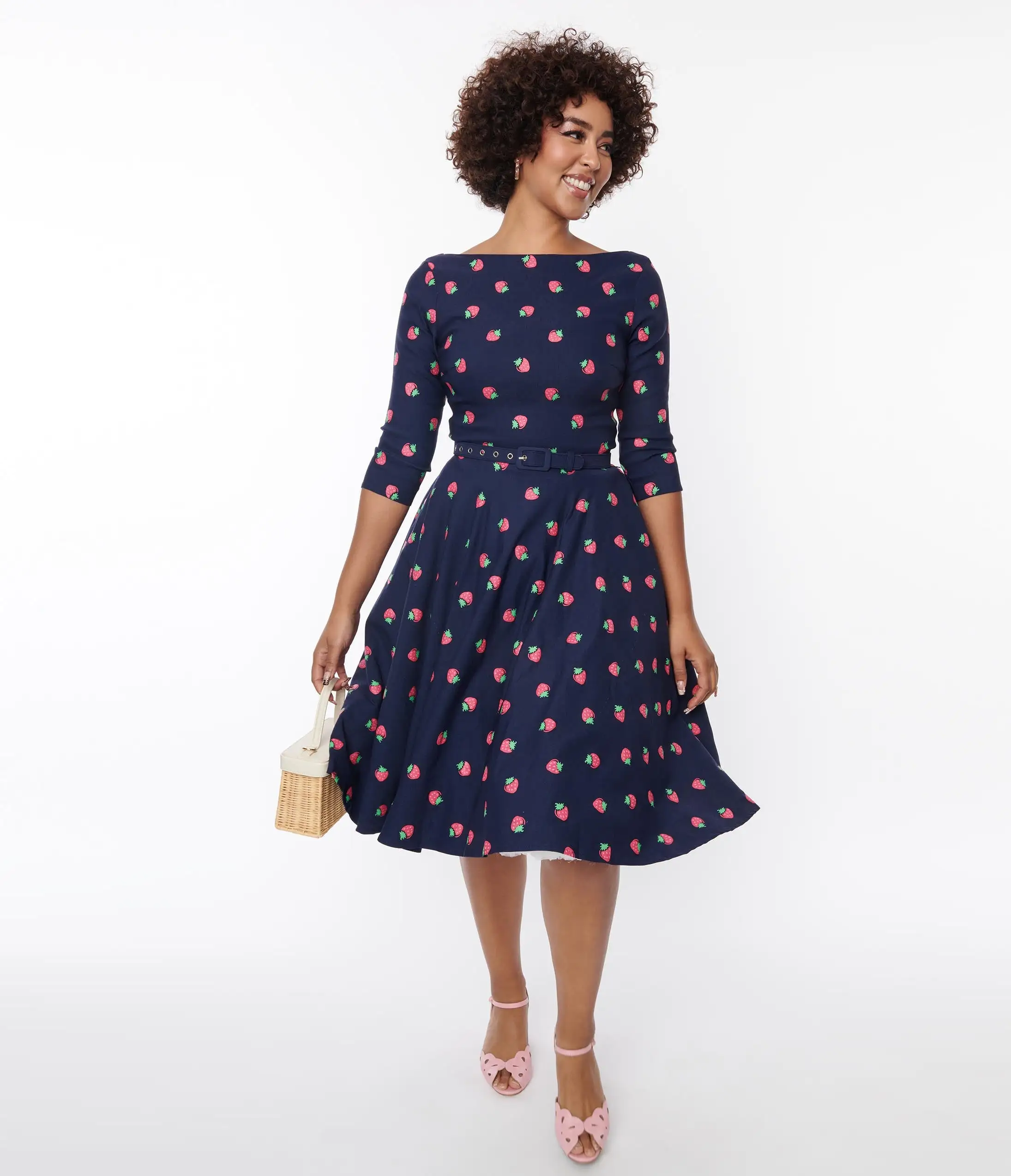 Devon’s got a relentless drive, gals! A fantastically faithful mid century silhouette from Unique Vintage, the Devon Dress is a sultry swing full of unstoppable beauty. Cast in a deep navy blue with playful pink strawberries throughout, the marvelous sturdy stretch fabric provides an enchanting and eye-catching embellishment to your figure with a darted bodice and dramatic bateau neckline that drops into a sultry V in the back. The sleek three-quarter length sleeves allow for cheeky pin-up posing as the dynamic swing skirt drops to your knees with ample room for a petticoat pop. Outfitted with hidden side pockets, a back zipper, and a charming belt to cinch in your form, drive it like you stole it!