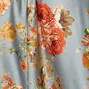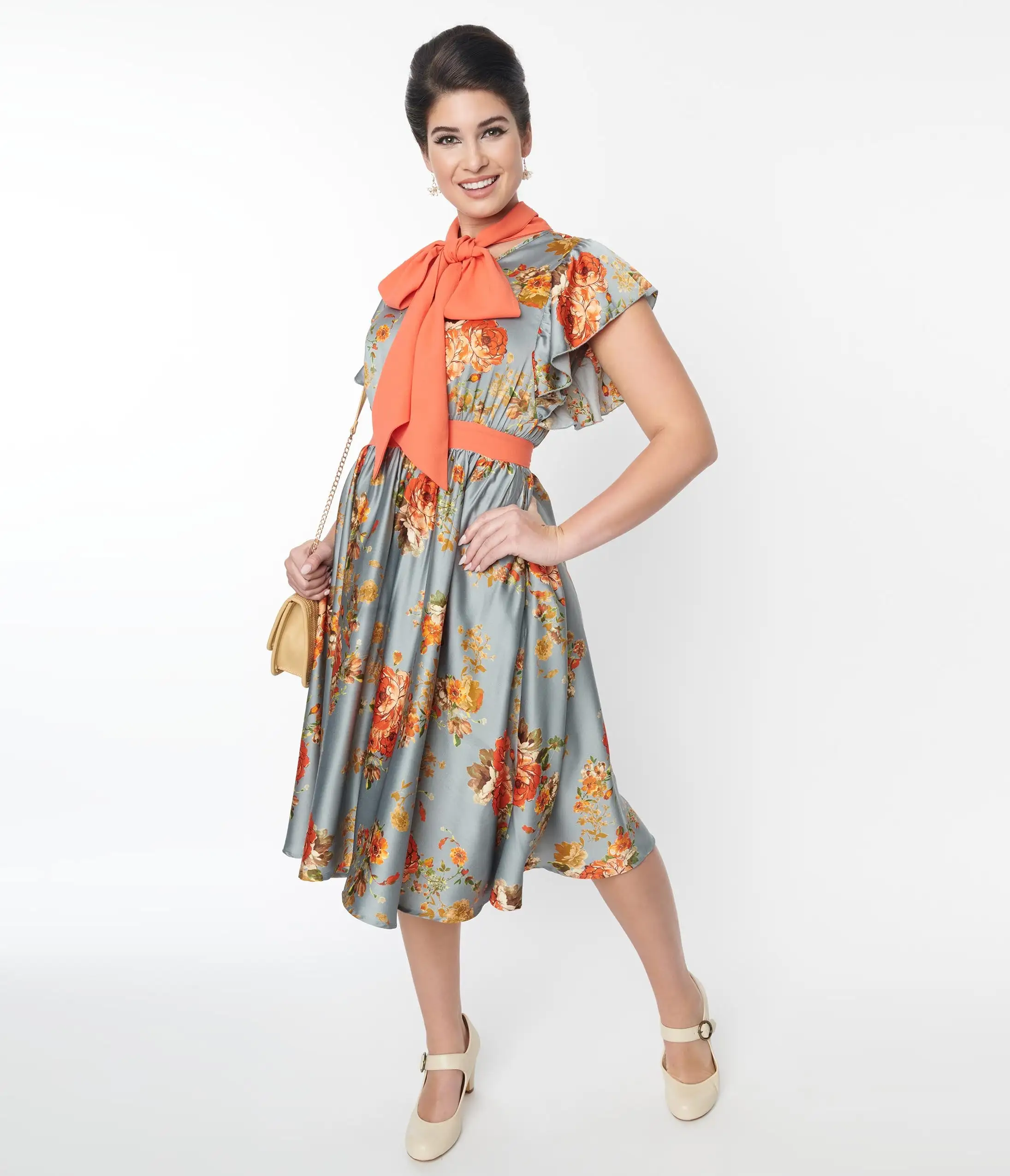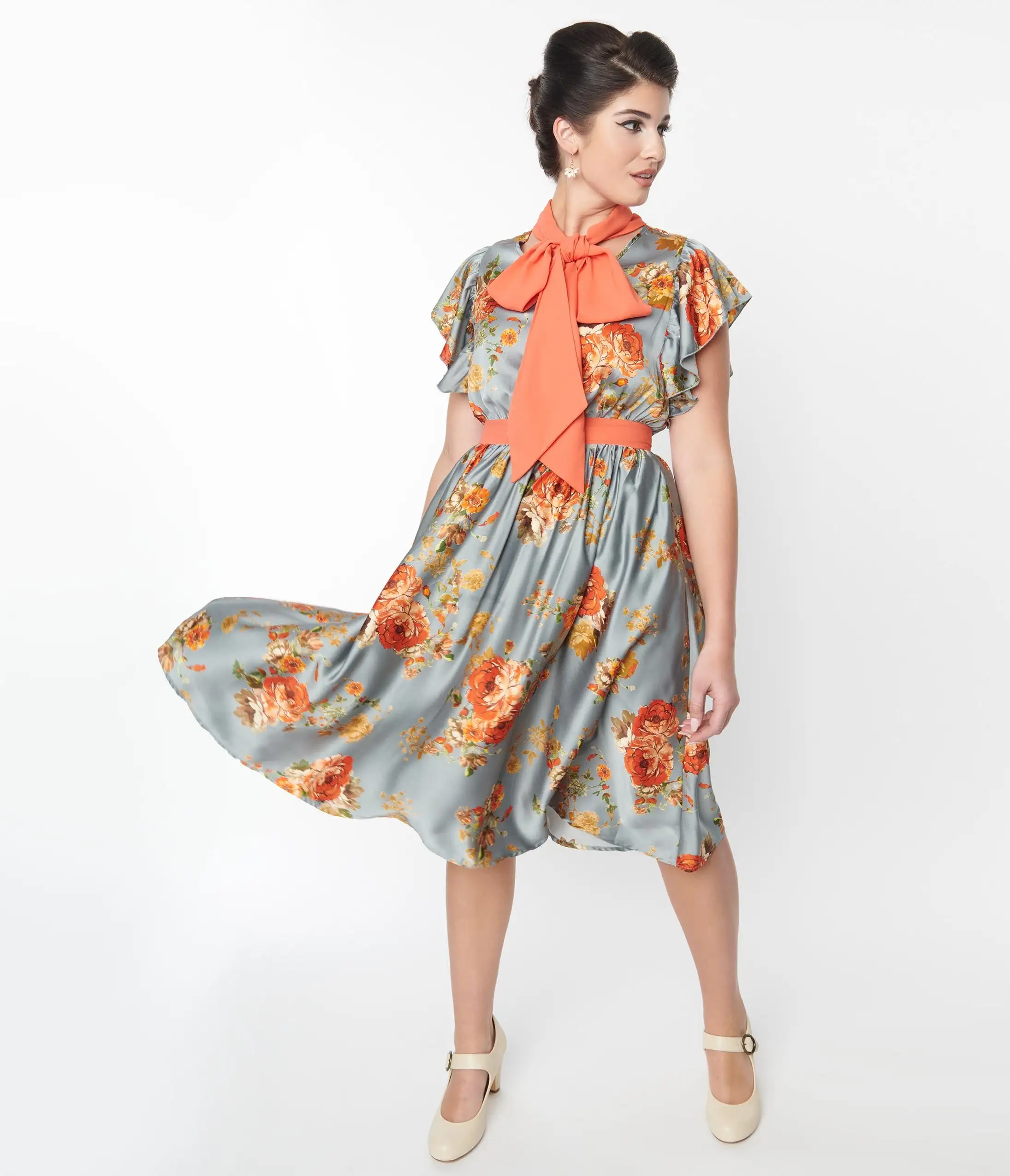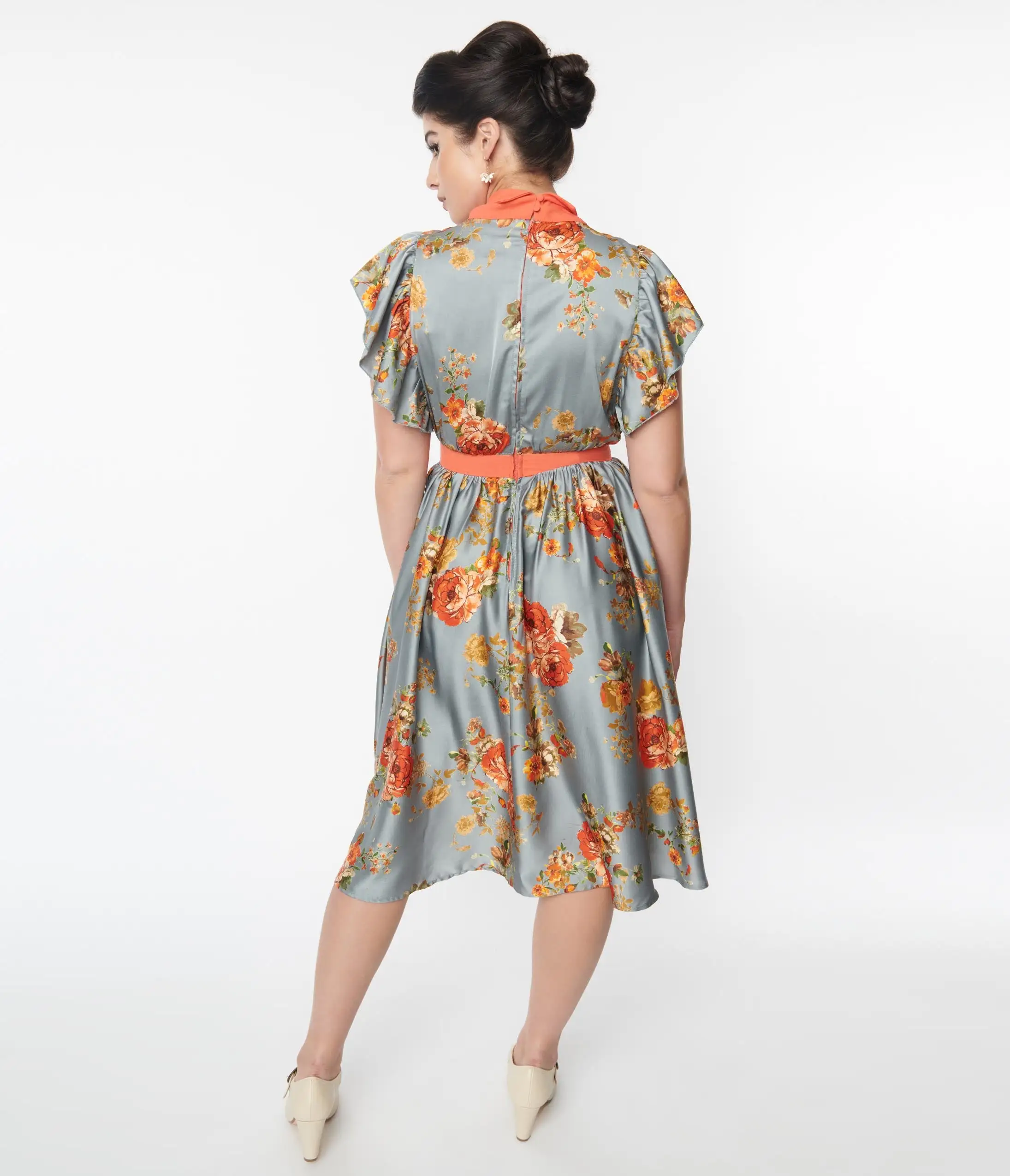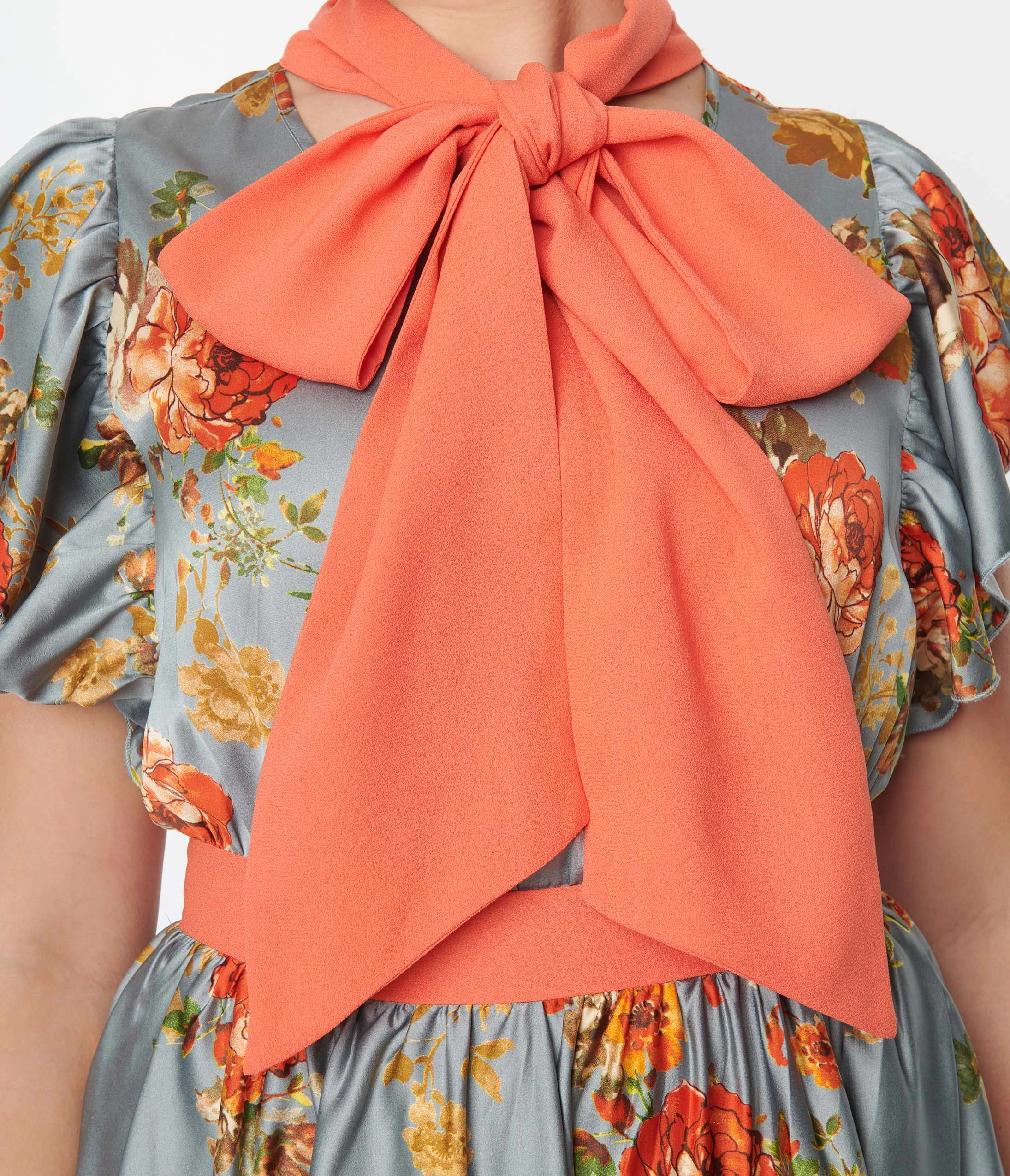 This lovely swing dress is crafted in a beautiful antique blue satin fabric, delicately adorned with orange florals throughout. Accented with an orange self-tie collar and framed with a frilled short sleeve. Complete with dual back collar buttons and side pockets for a modern flare!