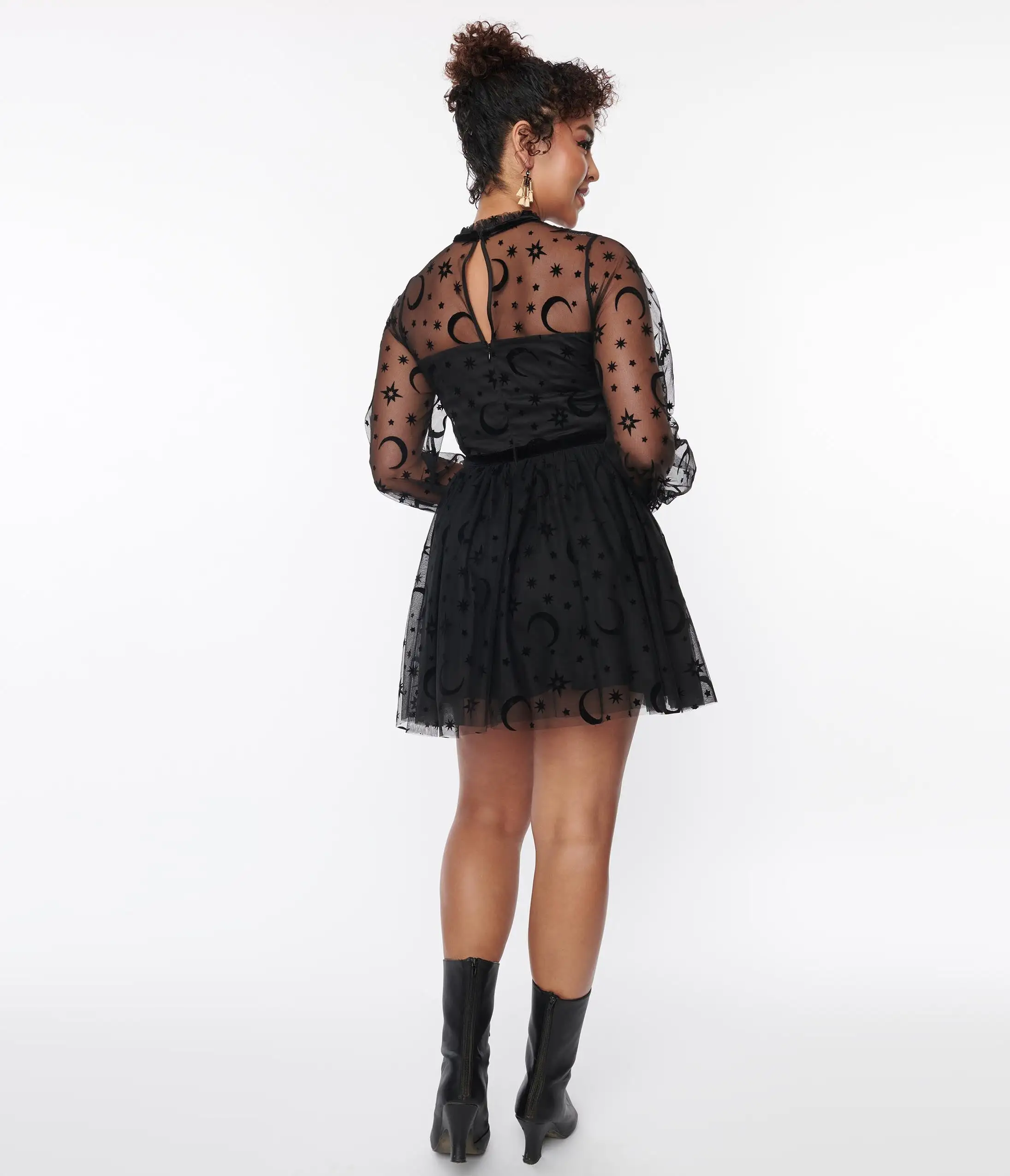 A bewitching and chic flare dress crafted in a lightweight black mesh that dances with flocked moons and stars throughout a black backdrop. Outfitted with a back zipper, back button keyhole, and elastic cuffs.