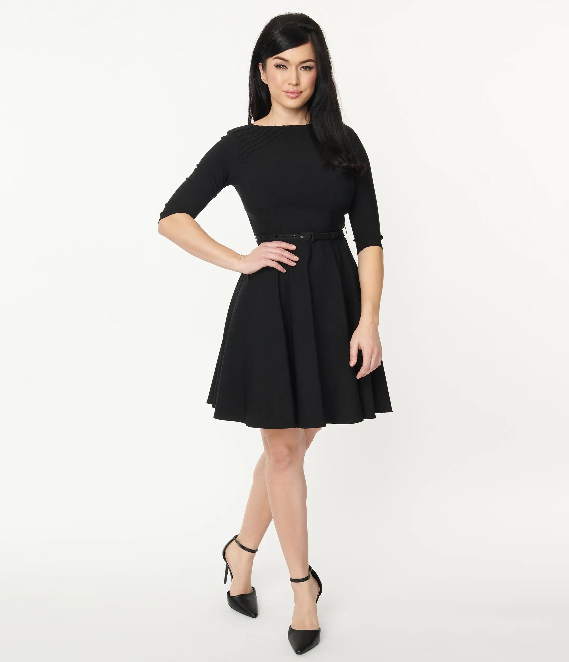 Bewitch away, darling! Show off your infatuation in an enamored retro inspired dress from Unique Vintage. This adorable fit and flare frock is a classic little black dress. Best of all, the bengaline fabric and princess seams are both comfortable and flattering, offset with symmetrical pin tucks for a streamlined and deliciously detailed look. Silhouette with three-quarter length sleeves and cinched at the waist with a removable belt, the perfect lure for a femme fatale!